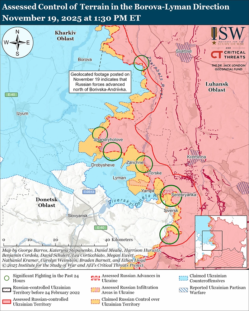 Оценка продвижения России: геолокационные кадры, опубликованные 19 ноября, свидетельствуют о том, что российские войска недавно продвигались к северу от Боровской-Андреевки (к северо-востоку от Боровой). [65]