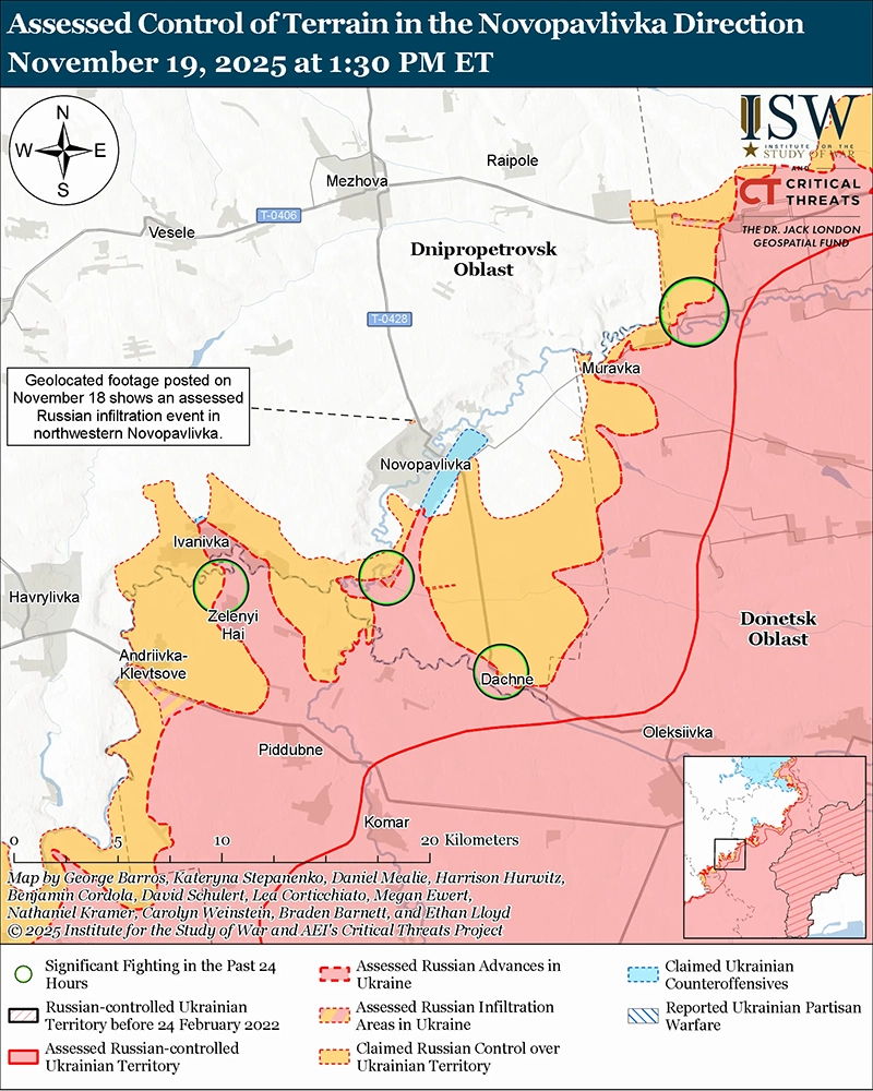 Оценка российской инфильтрации: геолокационные кадры, опубликованные 18 ноября, показывают, как украинские войска наносят удары по российским позициям на улице Молодёжная в северной части Новопавловки, что, по оценке ISW, было миссией по проникновению (ISW). [92] ISW оценивает, что это событие не изменило контроль над рельефом или передовой границей зоны боя (FEBA) на данный момент. ISW не может самостоятельно подтвердить вероятный маршрут проникновения российских войск на улицу Молодежная на севере Новопавловки.