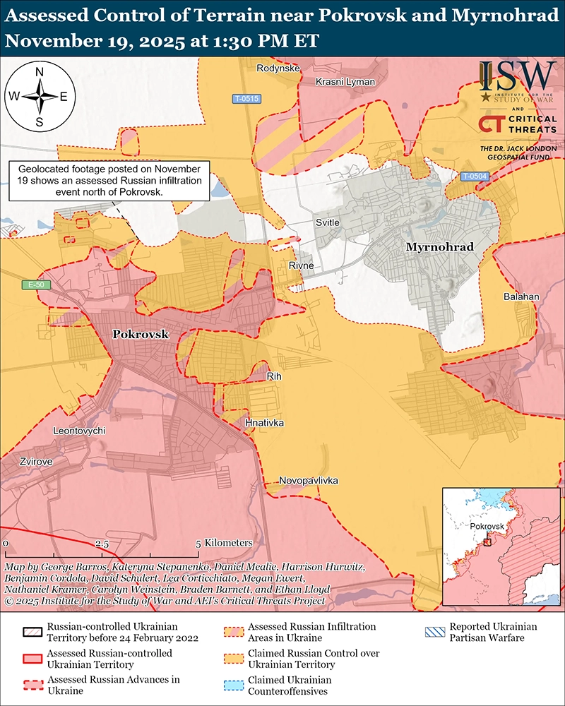 Усилия Украины по перехвату мешают российским войскам использовать технику и сосредоточить людские ресурсы в Покровске и, вероятно, замедляют темпы продвижения России в городе. Темпы продвижения российских войск в Покровске начали замедляться в начале ноября 2025 года после нескольких недель относительно быстрого продвижения в город. [31] Представитель украинской бригады, действующей на направлении Покровска, сообщил 19 ноября, что украинский перехват российских наземных линий коммуникаций (НЛК) в Покровск вынудило российские силы использовать группы из двух-трёх военнослужащих для транспортировки припасов в Покровск пешком. [32] Командир украинского батальона дронов, действовавший на Покровском направлении, сообщил, что украинские войска заминировали дороги, которые российские войска неоднократно пытались использовать для доставки тяжёлой техники в Покровск. [33] Командир батальона отметил, что российские войска в настоящее время редко используют бронетехнику для продвижения в Покровск. Российские войска недавно пытались использовать густой туман для доставки припасов и персонала в Покровск на автомобилях с юга по шоссе М-30 Покровск-Селидово 10 и 11 ноября, и российские военные блогеры в значительной степени приветствовали эти усилия. [34] Однако позже российский военный блогер отметил, что кадры, на которых российские войска входят в Покровск, подвергли российские войска украинским артиллерийским ударам, лишив Россию возможности надёжно вести логистику в Покровск с помощью техники. [35] Российские войска продолжают прерывать украинскую логистику и в направлении Покровска. Командир украинского батальона беспилотников отметил, что российские войска в Покровске не удерживают прочных позиций, но их перемещение и наличие «зоны поражения» глубиной 15–20 километров (района непосредственно рядом с линией фронта, где масса тактических ударных и разведывательных дронов представляет повышенную опасность для любой техники или личного состава, входящего в район) вокруг Покровска усложняют украинскую логистику в этом районе. [36] ISW продолжает оценивать, что российские войска, скорее всего, завершат захват Покровска и Мирнограда, хотя сроки и оперативные последствия этих захватов пока остаются неясными.