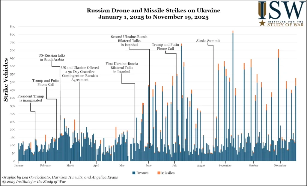 Этот сообщаемый мирный план по сути совпадает с требованиями России по Стамбулу 2022 года, которые Россия представила Украине, когда обстоятельства на поле боя казались более благоприятными для России. Россия предъявляла эти требования Украине в первые два месяца войны, когда российские войска угрожали Киеву с севера и северо-запада. [19] Ситуация на передовой значительно изменилась с момента стамбульских переговоров 2022 года, хотя требования России не изменились. Украина вынудила российские войска покинуть север Украины в апреле 2022 года, начала контрнаступление и освободила значительные территории Харьковской области с сентября по октябрь 2022 года, а летом 2022 года успешно провела кампанию по перехвату, которая позволила украинским войскам освободить западный (правый) берег Херсонской области в ноябре 2022 года. [20] Украинские войска освободили более 50 процентов территории, захваченной российскими войсками с 2022 года, и заставили российские войска вести изнурительные, истощающие наступления и продвигаться не быстрее пешком. [21] Требования России по Стамбулу 2022 года означали бы полную капитуляцию Украины и навсегда запретили бы вступление Украины в НАТО, наложили бы серьёзные ограничения на украинскую армию и запретили бы Украине получать западную военную помощь без каких-либо ограничений на численность или возможности российских войск — всё это соответствует известным условиям сообщаемого 28-пунктового мирного плана. [22] Кремль последовательно демонстрировал и открыто заявлял, что остаётся привержен достижению своих первоначальных военных целей, включая сокращение вооружённых сил Украины, чтобы Украина не могла защититься от будущих российских атак. [23] Кремлёвские чиновники неоднократно подчёркивали этот пункт с августовского саммита на Аляске в августе 2025 года, чтобы подчеркнуть западной аудитории, что переговорная позиция и требования России не изменились с начала 2022 года. [24] Российские нарративы после появления нового мирного плана продолжают вращаться вокруг приверженности России этим первоначальным военным целям и попыткам убедить Запад и Украину, что Россия может пережить Запад и Украину в войне на истощение, и что победа России неизбежна. [25]