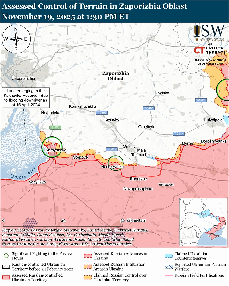 Российские войска продолжили наступательные операции в западной части Запорожской области 19 ноября, но не продвинулись.