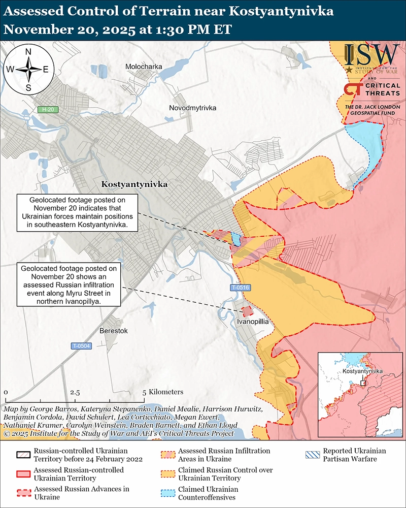 Оценка российского проникновения: видеоматериалы, опубликованные 16 ноября и геолокационные 20 ноября, показывают, как украинские войска наносят удары по российским военнослужащим на севере Иванополья (к юго-востоку от Константиновки) в рамках миссии, которую ISW оценивает как российскую инфильтрационную миссию, которая на тот момент не изменила контроль над рельефом или передовой границей боевых действий (FEBA). [67]