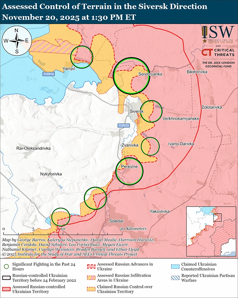 Российские войска атаковали вблизи и внутри самого Северска; к северо-западу от Северска возле Дроновки и Платоновки, в сторону Закитного и Дибровы; к северо-востоку от Северска возле Серебрянки; к востоку от Северска, возле Верхнекаменского; к юго-востоку от Северска, возле Выемки и Ивано-Дарьевки; и южнее Северска, возле Переизного, Федоровки и Звановки 19 и 20 ноября. [64]