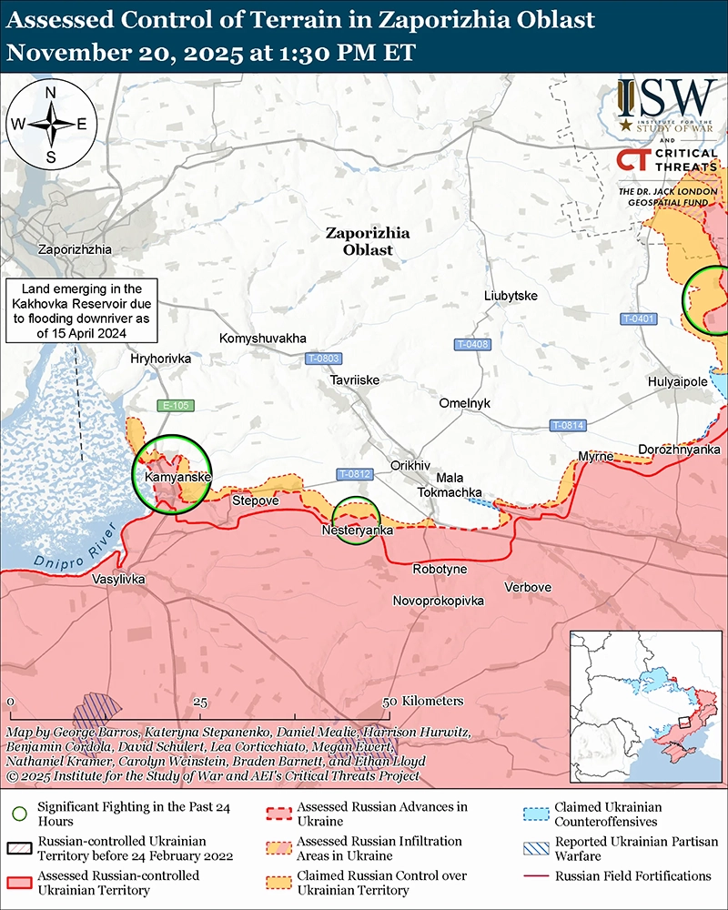 Российские войска продолжили наступательные операции в западной части Запорожской области 20 ноября, но не продвинулись.