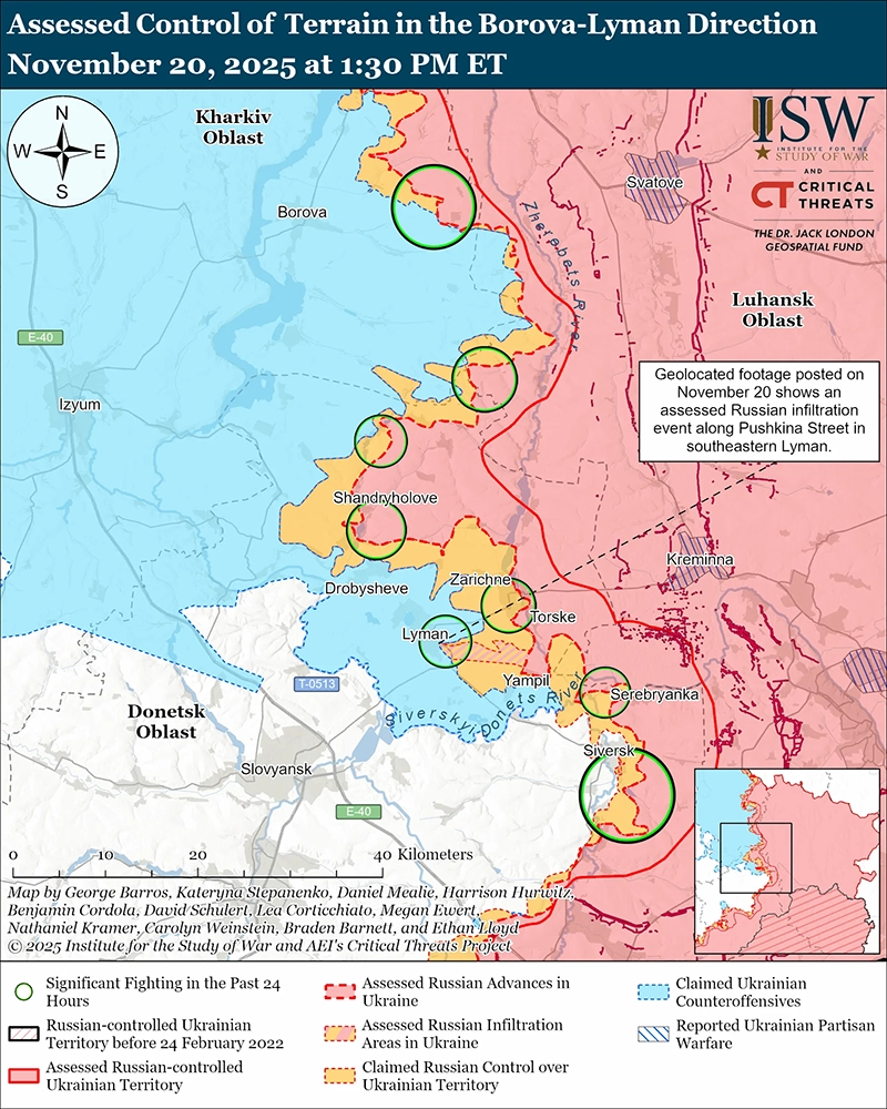 Путин и российское военное командование продолжают продвигать ложную версию о неизбежности победы России, чтобы подтолкнуть Украину и Запад к уступкам российским требованиям. Примечательно, что Путин был в военной форме на своей встрече 20 ноября на командном пункте Западной группировки войск – это уже четвёртый раз, когда он надел военную форму на публичное мероприятие с начала полномасштабного вторжения, и всего через несколько недель после второго и третьего раза в середине сентября и конце октября 2025 года.[25] Герасимов начал свой доклад с утверждения, что российские войска продвигаются практически по всем фронтам на поле боя. Герасимов заявил, что российские войска захватили более 80 процентов Волчанска и более 75 процентов Покровска. Однако ISW наблюдала лишь свидетельства, позволяющие оценить, что российские войска захватили 34 процента Волчанска и 46 процентов Покровска. Командующий Южной группировкой войск России генерал-лейтенант Сергей Медведев, который недавно стал командующим после службы в должности начальника штаба группировки, заявил, что российские войска взяли под контроль восточную и юго-восточную Константиновку и начали зачищать центральный район. Однако ISW наблюдал лишь свидетельства российских миссий по проникновению в ограниченные районы юго-восточной Константиновки. Медведев заявил, что российское военное командование планирует захватить большую часть Константиновки к середине декабря 2025 года. Путин ответил, что не важно устанавливать конкретные сроки, но заявление Медведева является попыткой изобразить российское военное командование уверенным в своей способности быстро захватить южную оконечность сильно укрепленного Крепостного пояса Украины.