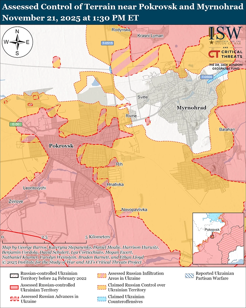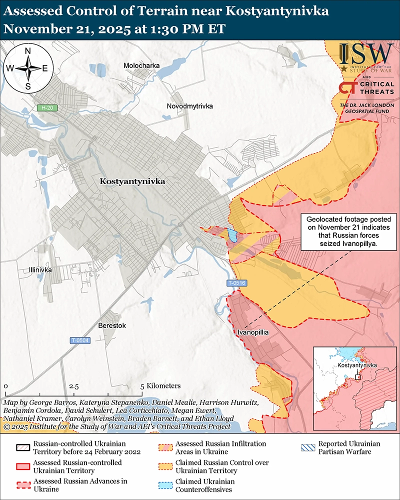 Предлагаемый мирный план не приблизит Россию и Украину к справедливому и прочному миру, а создаст условия для возобновления российской агрессии против Украины в будущем. 21 ноября издание Axios сообщило, что план из 28 пунктов включает гарантии безопасности для Украины, аналогичные «статье 5» — отсылая к положению НАТО о коллективной обороне, — но эти гарантии будут действовать только 10 лет и должны быть продлены.[22] Срок действия гарантий безопасности для Украины позволит России повторно вторгнуться в Украину с опытными, отдохнувшими и восстановленными войсками после истечения срока действия гарантий.[23] Линии фронта, обозначенные предлагаемым мирным планом, также в значительной степени благоприятствуют новому российскому вторжению.[24] Любое мирное соглашение, требующее вывода украинских войск из Донецкой области, вынудит Украину отойти на линии, которые будут в значительной степени несостоятельны против возобновления российской агрессии и, вероятно, позволят России начать новые наступления на юг Харьковской области и на восток Запорожской и Днепропетровской областей с предлагаемой «замороженной» линии фронта.