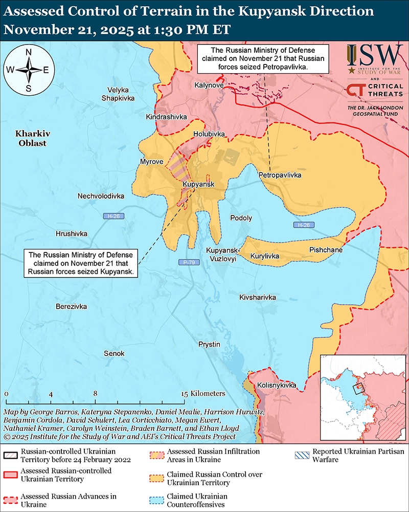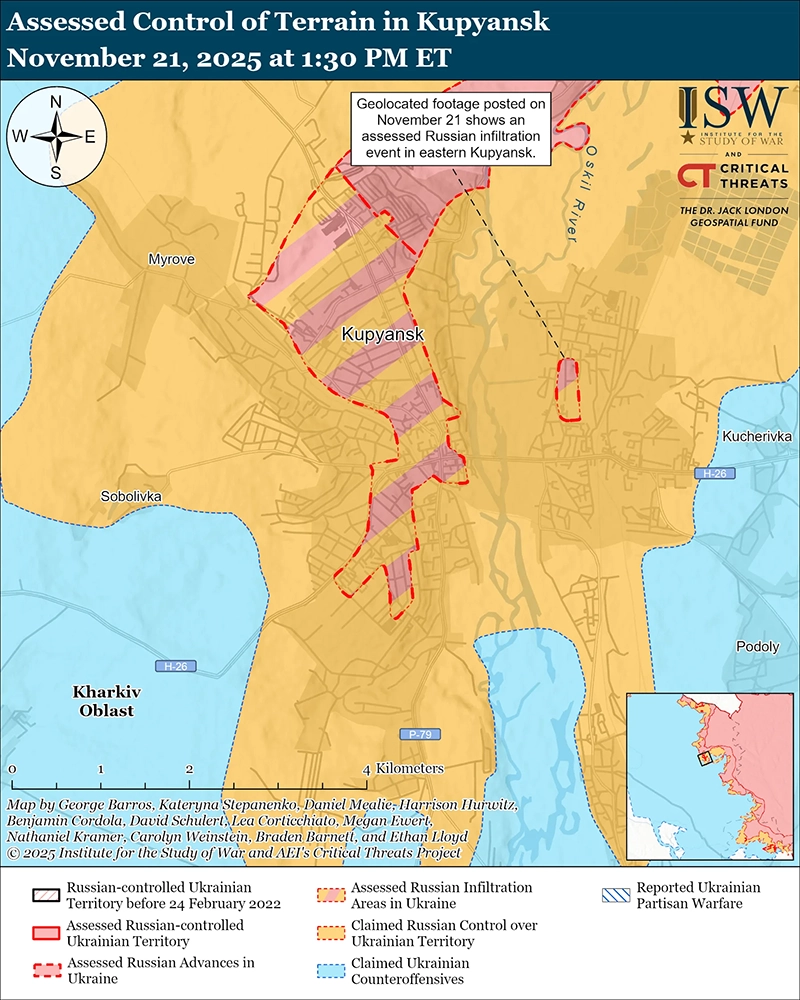 Российское военное командование продолжало преувеличивать заявления об успехах в Купянске – нарратив, который Кремль начал активно продвигать в конце августа 2025 года.[26] Герасимов утверждал, что российские войска захватили весь Купянск.[27] Командующий Западной группировкой войск России генерал-полковник Сергей Кузовлев заявил, что подразделения российской 68-й мотострелковой дивизии (6-я общевойсковая армия [ОА], Ленинградский военный округ [ЛВО]) захватили и сохраняют контроль над Купянском, но российские войска все еще уничтожают небольшие, разрозненные украинские группы в городе. Кузовлев утверждал, что подразделения 68-й мотострелковой дивизии взаимодействуют с подразделениями 47-й танковой дивизии и 27-й мотострелковой бригады (обе из 1-й гвардейской танковой армии [ГТА], Московского военного округа [МВО]) для уничтожения украинских войск, окруженных на восточном (левом) берегу реки Оскол в направлении Купянска. На заседании Совета Безопасности 21 ноября Путин заявил, что Купянск — недавний пример того, что российские войска «неизбежно» повторят на других участках фронта[28]. Купянск — это, в частности, один из участков фронта, где украинские силы успешно отражают наступление России[29]. ISW продолжает оценивать, что украинские силы на Купянском направлении впервые за последние годы успешно отражают российские попытки захватить населённый пункт такого масштаба[30].