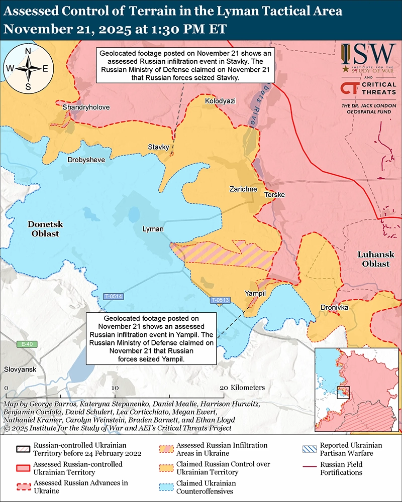 Представитель 11-го армейского корпуса (АК) Украины подполковник Дмитрий Запорожец сообщил 21 ноября, что российские войска больше не атакуют Ямполь напрямую из-за больших потерь и перешли к попыткам обойти Ямполь с севера, чтобы продвинуться к Лиману.[75] Запорожец отметил, что российские войска пользуются плохими погодными условиями, которые снижают эффективность украинских беспилотников, для скрытного наступления с использованием тепловых маскировок.