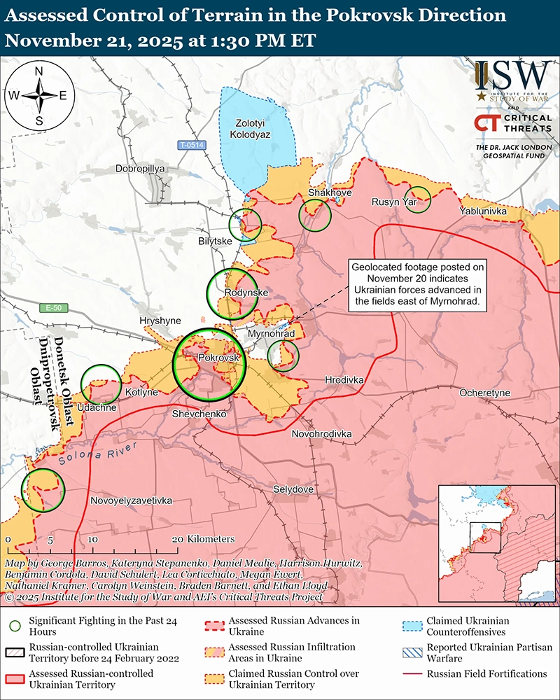 Российские войска атаковали внутри и вокруг самого Покровска; северо-западнее Покровска в сторону Гришино; к северу от Покровска возле Родинского; северо-восточнее Покровска возле Червоного (Красного) Лимана и Новоэкономического; к востоку от Покровска возле Мирнограда и Ровного; к юго-востоку от Покровска возле Лысовки; и юго-западнее Покровска, возле Котлина, Удачного и Молодецкого 20 и 21 ноября. [99] Российские источники, включая Министерство обороны России, утверждали, что украинские войска контратаковали возле Мирнограда и Гришино. [100]