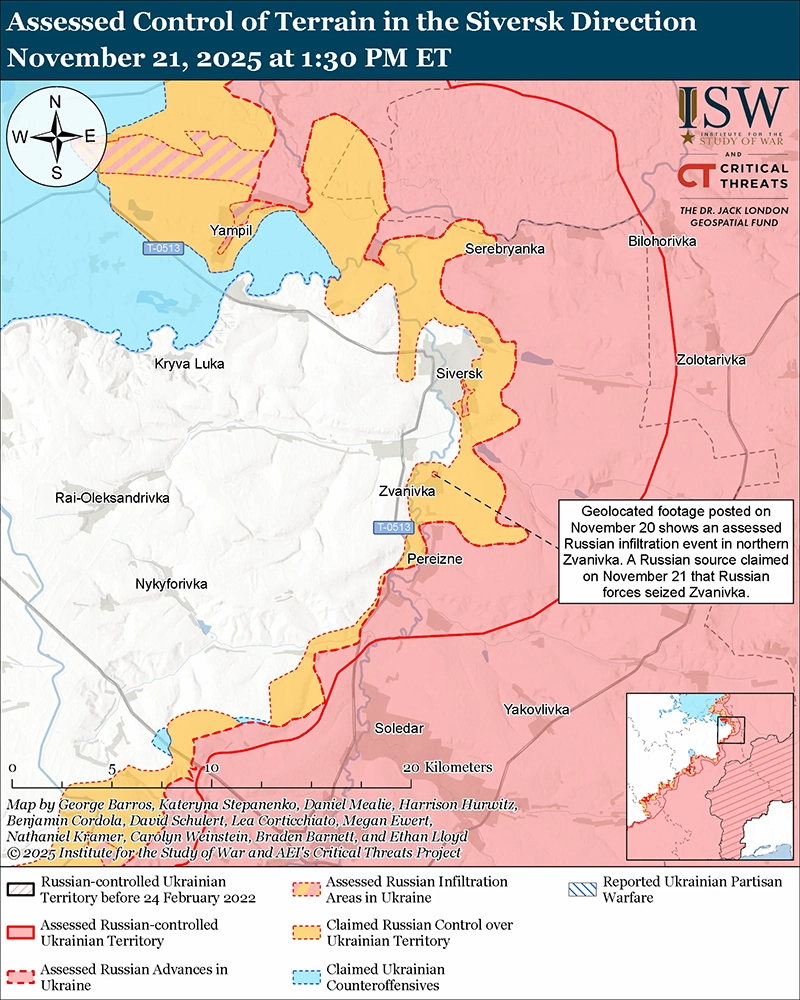 Российские войска атаковали вблизи и внутри самого Северска; к северо-западу от Северска возле Дроновки и Платоновки, в сторону Закитного и Дибровы; к северо-востоку от Северска возле Серебрянки; к юго-востоку от Северска возле Выемки; южнее Северска, возле Переездного и Звановки; и юго-западнее Северска в сторону Свято-Покровского 20 и 21 ноября. [83]