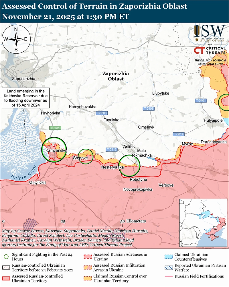 Российские войска атаковали юго-восточнее Орехова возле Малой Токмачки и Новоданиловки, а также к западу от Орехова возле Степногорска, Каменского, Новоандреевского, Щербаков, Приморского и Степного 20 и 21 ноября. [119]