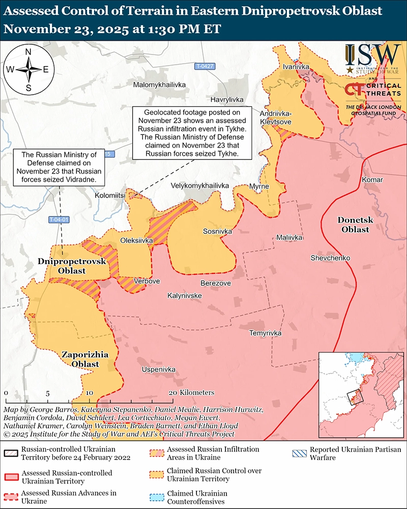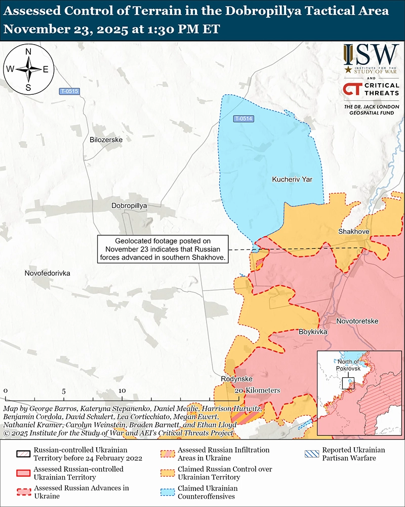 Оценка продвижения России: геолокационные кадры, опубликованные 23 ноября, свидетельствуют о том, что российские войска недавно немного продвинулись на западных окраинах Иванополья (к юго-востоку от Константиновки). [79]