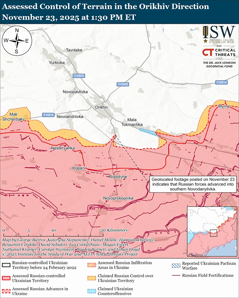 Оценка продвижения России: геолокационные кадры, опубликованные 23 ноября, свидетельствуют о том, что российские войска продвигались в южной части Новоданиловки (к югу от Орехова) в ходе недавнего механизированного штурма в этом районе. Украинская бригада, действующая на западе Запорожской области, сообщила 23 ноября, что украинские войска уничтожили два танка, два бронетранспортера (БТР) и один мотоцикл во время российского механизированного наступления. [109] Другая украинская бригада, действовавшая в этом районе, сообщила, что российские войска 21 ноября провели по крайней мере уменьшенную механизированную атаку силой до роты возле Малой Токмачки (к востоку от Новоданиловки). [110] Российский военный блогер утверждал, что российские войска продвигаются к северо-востоку от Щербаки; к северу от Малые Щербаки; а также на северо-запад и северо-восток от и в центральной части Степногорска (все к западу от Орехова). [111]