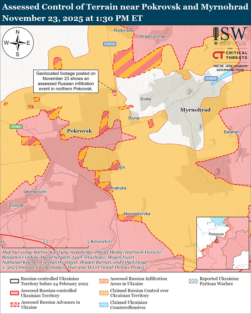 Украинские войска продолжают контратаковать и сохраняют ограниченное присутствие в Покровске и его окрестностях. 23 ноября украинский 7-й корпус быстрого реагирования Воздушно-штурмовых войск сообщил, что бои в центре Покровска продолжаются, и что украинские войска не позволяют российским войскам сосредоточить достаточно сил для продвижения в северную часть города.[29] 7-й корпус отметил, что российские войска несут тяжёлые потери при попытках продвинуться в северную часть Покровска по Донецкой железной дороге. 23 ноября российский военблогер также признал, что украинские войска сохраняют рассредоточенное присутствие между Казацким (к востоку от Мирнограда) и Проминем (к югу от Казацкого).[30] Российские военблогеры также утверждали, что украинские войска контратакуют в северной части Покровска и в районе Гришино (к северо-западу от Покровска).[31]