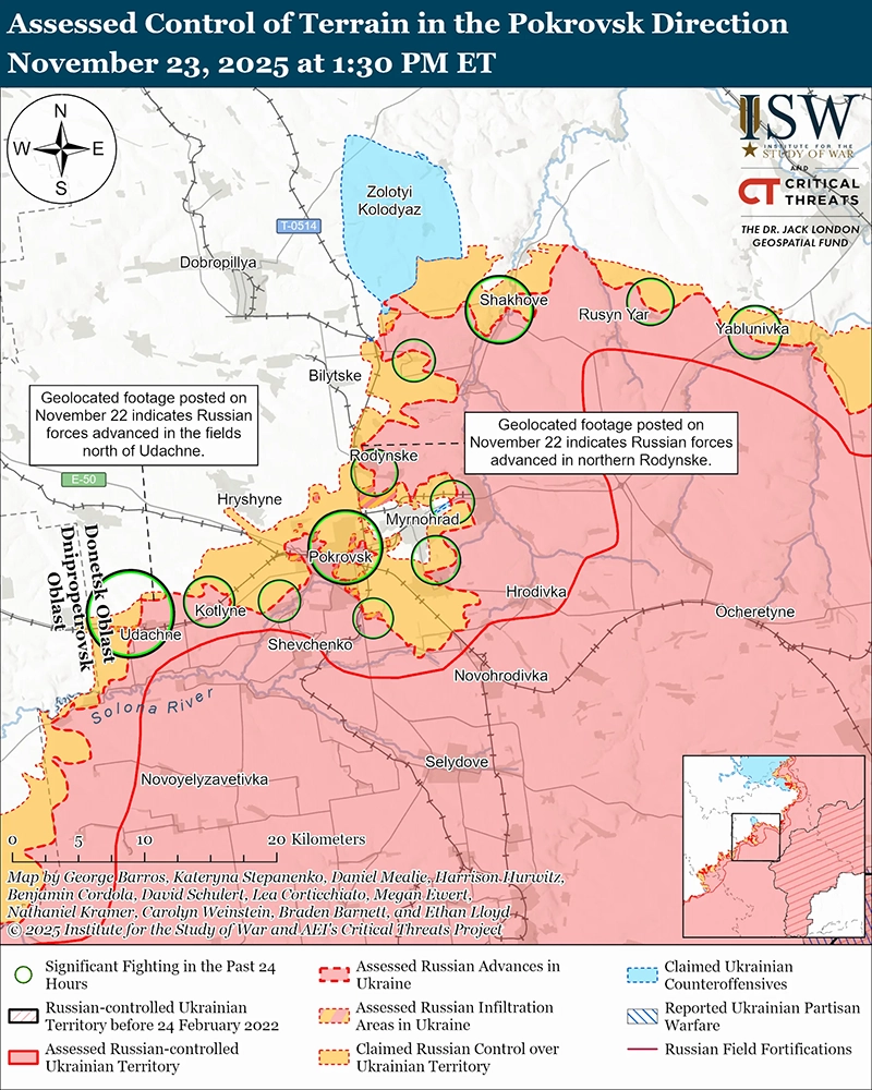Ситуация на Покровском направлении остаётся серьёзной и динамичной: российские войска продолжают наступление, чтобы закрыть покровско-мирноградский котел, а украинские войска продолжают контратаки. Российские войска продолжают попытки завершить окружение покровско-мирноградского котла, продвигаясь по северному флангу кольца. Геолокационные кадры, опубликованные 22 ноября, свидетельствуют о недавнем продвижении российских войск в районе северного Родинского (к северу от Покровска)[26]. Дополнительные геолоцированные кадры, опубликованные 22 ноября, показывают, что украинские силы наносят удар по российским войскам в северной части Покровска после того, что ISW оценивает как российскую миссию проникновения, которая не изменила контроль над местностью или передним краем района боевых действий (FEBA) на данный момент. [27] Связанный с Кремлем российский военблогер заявил 23 ноября, что российские войска завершают операции по зачистке в Покровске. [28] Военблогер заявил, что российские войска создали «зону поражения» (район в непосредственной близости от линии фронта, где масса тактических ударных и разведывательных беспилотников представляет повышенный риск для любой техники или личного состава, которые входят в этот район) между Покровском и Червоным Лиманом (к северу от Мирнограда). Военблогер заявил, что российская наступательная активность усиливается в Мирнограде и что операторы беспилотников входят в город. Военблогер заявил, что весьма вероятно, что остальная часть агломерации Покровск-Мирноград является оспариваемой «серой зоной».