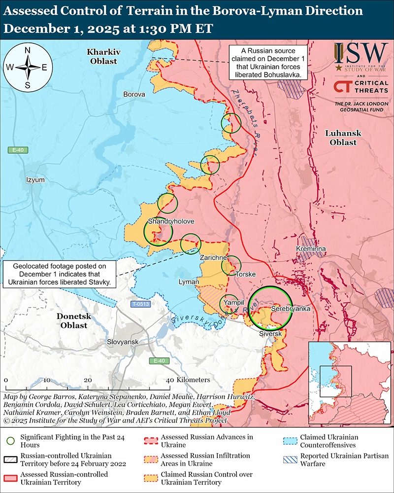 Уточнение территорий, находящихся под российскими претензиями: российский военблогер, связанный с Кремлём, 30 ноября намекнул, что украинские войска удерживают позиции в Богуславке (к северу от Боровой), где, по данным российских источников, ранее присутствовали российские войска. [52]