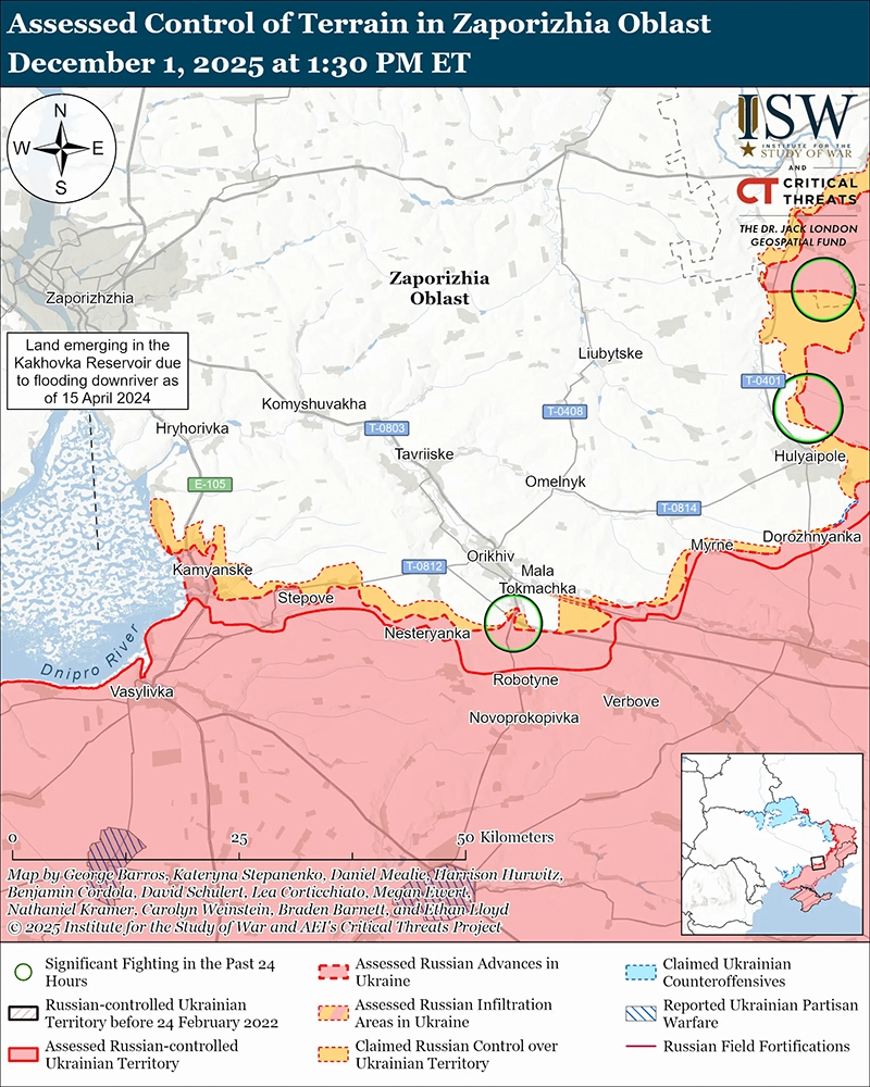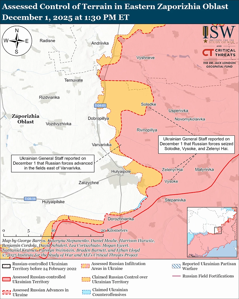 Оценка продвижения российских войск: Генеральный штаб Украины 1 декабря опубликовал карты, показывающие, что российские войска захватили Зеленый Гай и Высокое (оба к востоку от Гуляйполя) и продвинулись к западным окраинам Солодкое, к северу и западу от Ровнополья (оба к северо-востоку от Гуляйполя), к югу и юго-западу от Яблокова (к северу от Гуляйполя) и к западу от Высокого. [86]