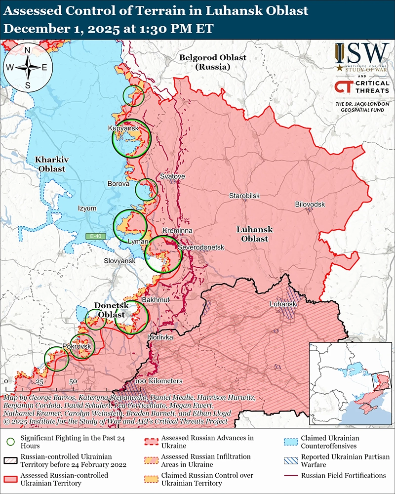 Пресс-секретарь Украинской объединённой оперативной группы полковник Виктор Трегубов заявил, что российские силы в направлении Купянска продолжают использовать тактику проникновения малыми группами. [50] Трегубов опроверг заявления Кремля о том, что российские войска захватили Купянск по состоянию на октябрь 2025 года. Сообщается, что один из российских военнослужащих 68-й мотострелковой дивизии (6-я общевойсковая армия [ОА], Ленинградский военный округ [ЛВО]), пожаловался 1 декабря, что украинские дроны с видом от первого лица (FPV) мешают передвижению России в Купянске. [51]