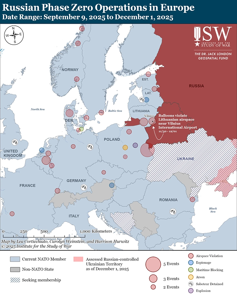 Вторжения воздушных шаров в воздушное пространство НАТО продолжают закрывать литовские аэропорты. Литовские власти временно приостановили работу Вильнюсского международного аэропорта с вечера 30 ноября до раннего утра 1 декабря из-за воздушных шаров, летящих в сторону аэропорта.[28] Директор литовской аэронавигационной компании Oro Navigacija Саулюс Батавичюс заявил, что власти обнаружили около 60 воздушных шаров в воздушном пространстве Литвы и что неустановленное лицо непрерывно запускало воздушные шары на разных высотах и небольшими группами.[29] На момент написания этого отчета литовские власти не приписали полеты воздушных шаров какому-либо конкретному лицу, хотя ранее литовские официальные лица приписывали подобные вторжения воздушных шаров Беларуси.[30] Ночные наблюдения воздушных шаров происходят на фоне неоднократных подобных вторжений из воздушного пространства Беларуси, последнее из которых произошло в ночь с 28 на 29 ноября, которые привели к закрытию Вильнюсского аэропорта.[31] ISW продолжает оценивать, что Россия все чаще участвует в скрытых и открытых атаках на Европу и что продолжающиеся нарушения российского воздушного пространства, вероятно, являются частью усилий России в рамках «Фазы Ноль» — более масштабных информационных и психологических усилий России по созданию условий, направленных на подготовку к возможной войне между НАТО и Россией в будущем.[32] ISW продолжает оценивать, что Беларусь является фактическим союзником России в войне в Украине, поэтому предполагаемые и подтвержденные вторжения в воздушное пространство НАТО из воздушного пространства Беларуси, скорее всего, являются частью более масштабных усилий России в рамках «Фазы Ноль».[33]