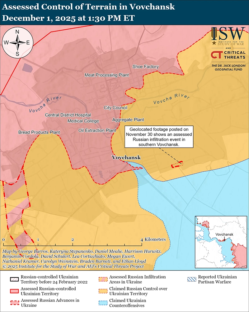 Уточнение территорий, находящихся под российскими претензиями: геолокационные кадры, опубликованные 1 декабря, свидетельствуют о том, что украинские войска удерживают позиции или недавно наступали в северной Куриловке (к юго-востоку от Купянска), где российские источники ранее утверждали, что российские войска сохраняли присутствие. [48]