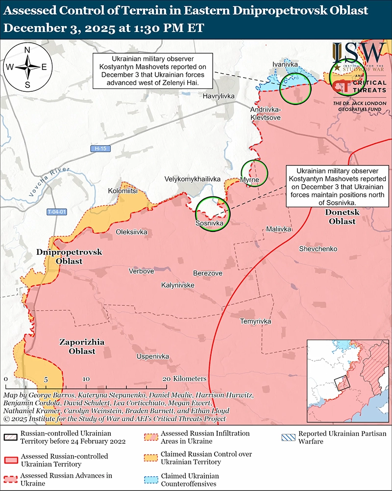 Уточнение территории, на которую претендует Россия: украинский военный обозреватель Константин Машовец заявил 3 декабря, что украинские войска сохраняют позиции к юго-востоку от Великомихайловки, района, где, по утверждениям российских источников, ранее присутствовали российские войска.[96]