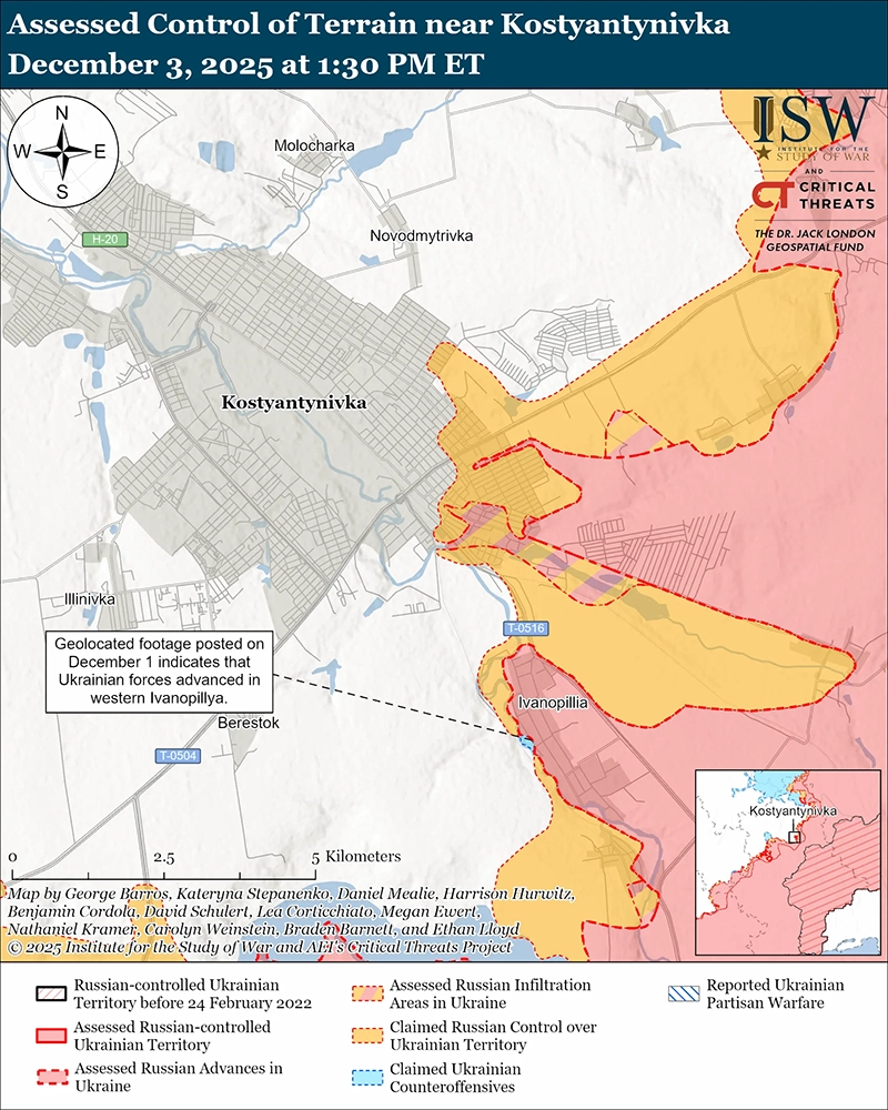 Уточнение района, на который претендуют российские войска: кадры, опубликованные 28 ноября и геолоцированные 3 декабря, указывают на то, что украинские войска недавно сохраняли позиции или продвигались вдоль трассы Т-0516 Торецк-Константиновка в южной части Константиновки – района, где, по ранее заявленным российским источникам, сохранялось присутствие российских войск.[76]