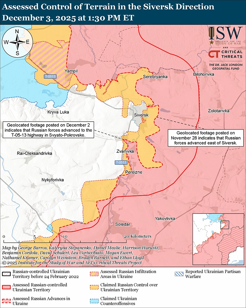 Российские войска атаковали вблизи и внутри самого Северска; северо-западнее Северска в районе Дроновки, Платоновки и Закитного; северо-восточнее Северска в районе Серебрянки; и юго-западнее Северска в районе Федоровки и Свято-Покровского 2 и 3 декабря.[69]