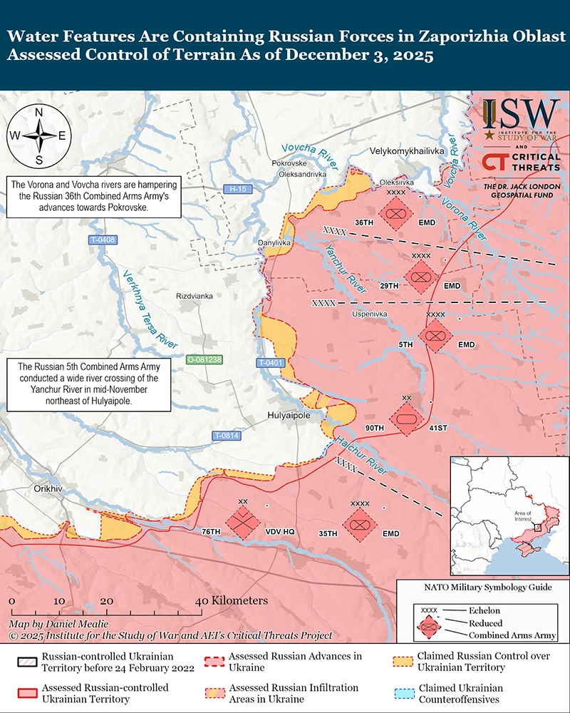 Тактический прорыв 5-й ОА к северу и северо-востоку от Гуляйполя может позволить российским войскам добиться оперативных успехов как на Гуляйпольском, так и на Ореховском направлениях. Однако способность России использовать такой прорыв во многом зависит от украинского сопротивления и воспрепятствования российским переправам через реки. Подразделения 5-й ОА достигли тактического прорыва к северу и северо-востоку от Гуляйполя после захвата тактического плацдарма на реке Янчур в районе Успеновки (на западном берегу реки Янчур) в ноябре 2025 года[24]. Украинские военные источники сообщили, что российские войска смогли продвинуться в этом районе, используя тактику просачивания и используя туманную погоду, которая подорвала операции украинских беспилотников в этом районе[25]. Сельская местность к западу от Успеновки, вероятно, способствовала быстрому продвижению российских войск к реке Гайчур, протекающей через Гуляйполе. Украинские войска, вероятно, испытывали трудности с обороной позиций на открытой местности к западу от Успеновки, что позволило российским войскам относительно быстро продвинуться на 17 километров в глубину. Теперь российским войскам предстоит задача форсирования реки Гайчур.