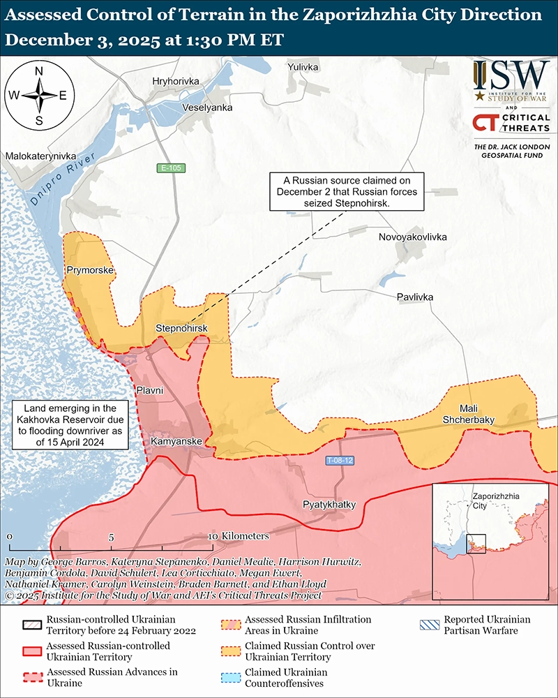 Российские войска атаковали юго-восточнее Орехова в районе Малой Токмачки; южнее Орехова в районе Новоданиловки; и западнее Орехова в районе Степногорска и Приморского 2 и 3 декабря.[104]