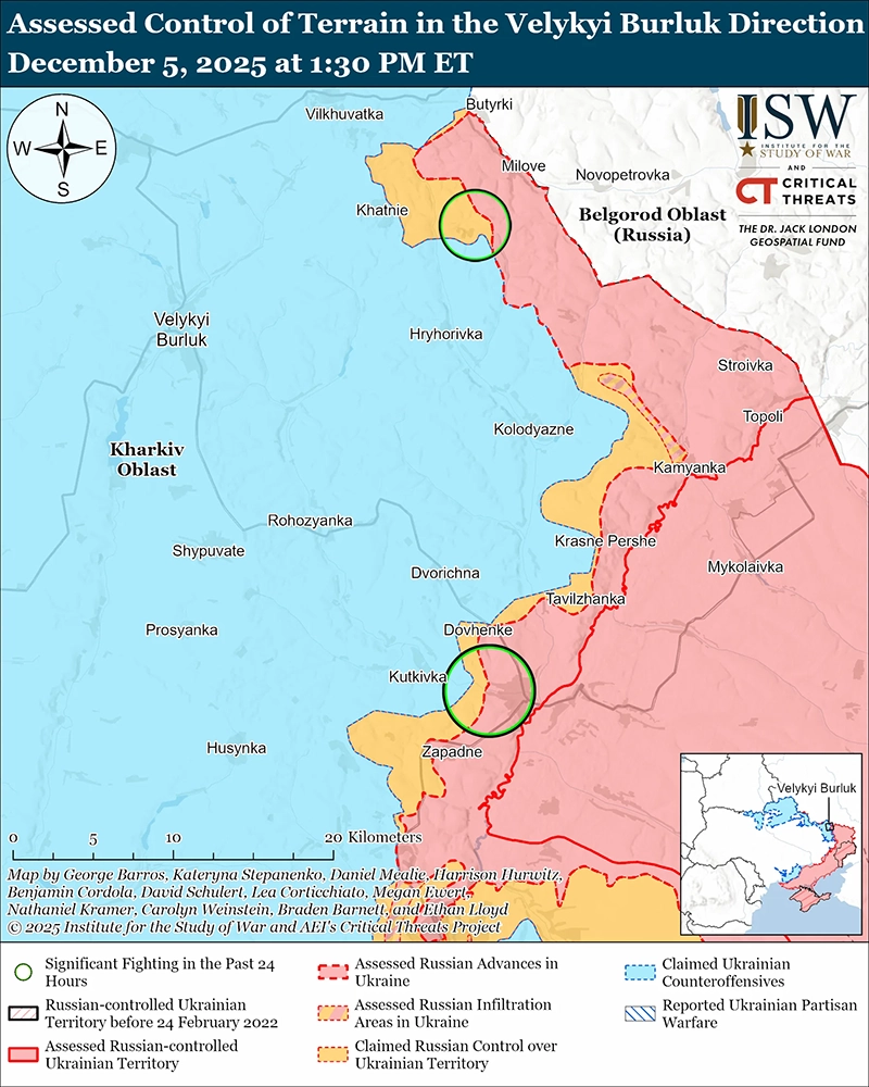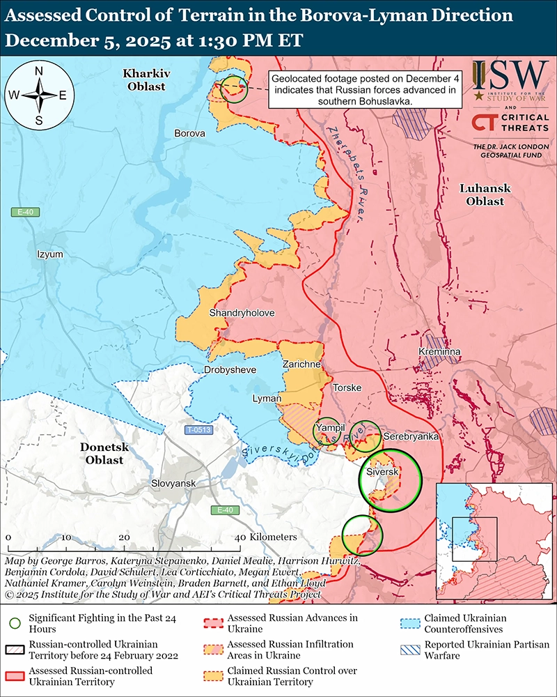 Оценка российских наступлений: геолокационные кадры, опубликованные 4 декабря, свидетельствуют о том, что российские войска недавно продвинулись в южной части Богуславки (к северу от Боровой).[43]