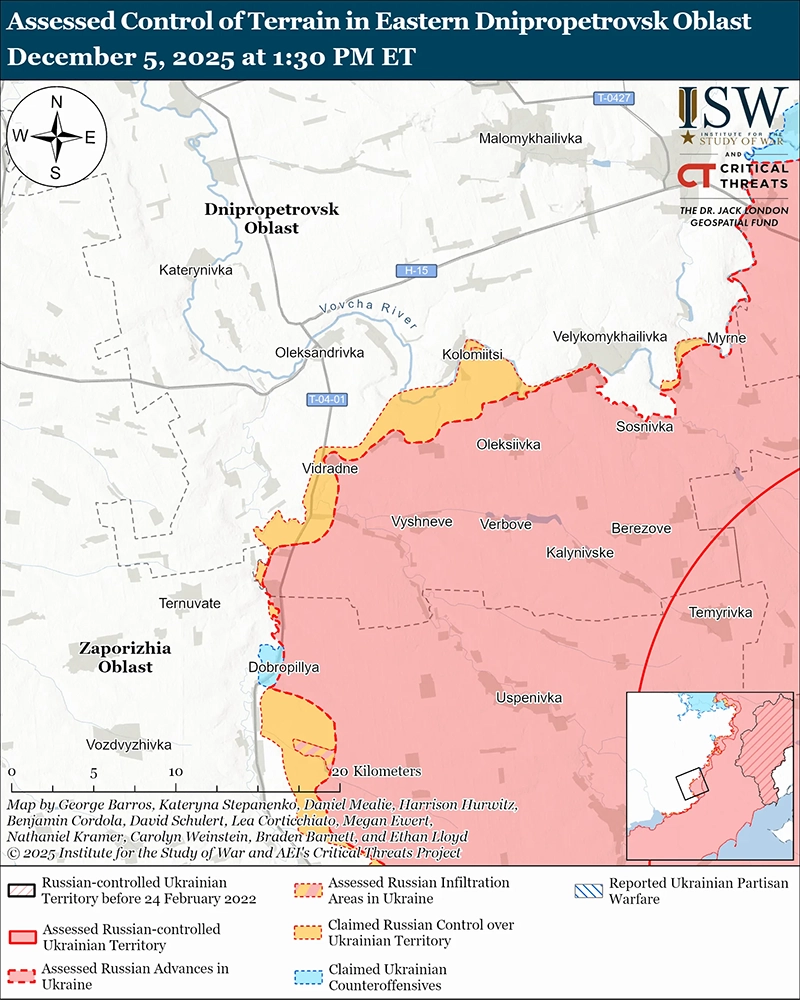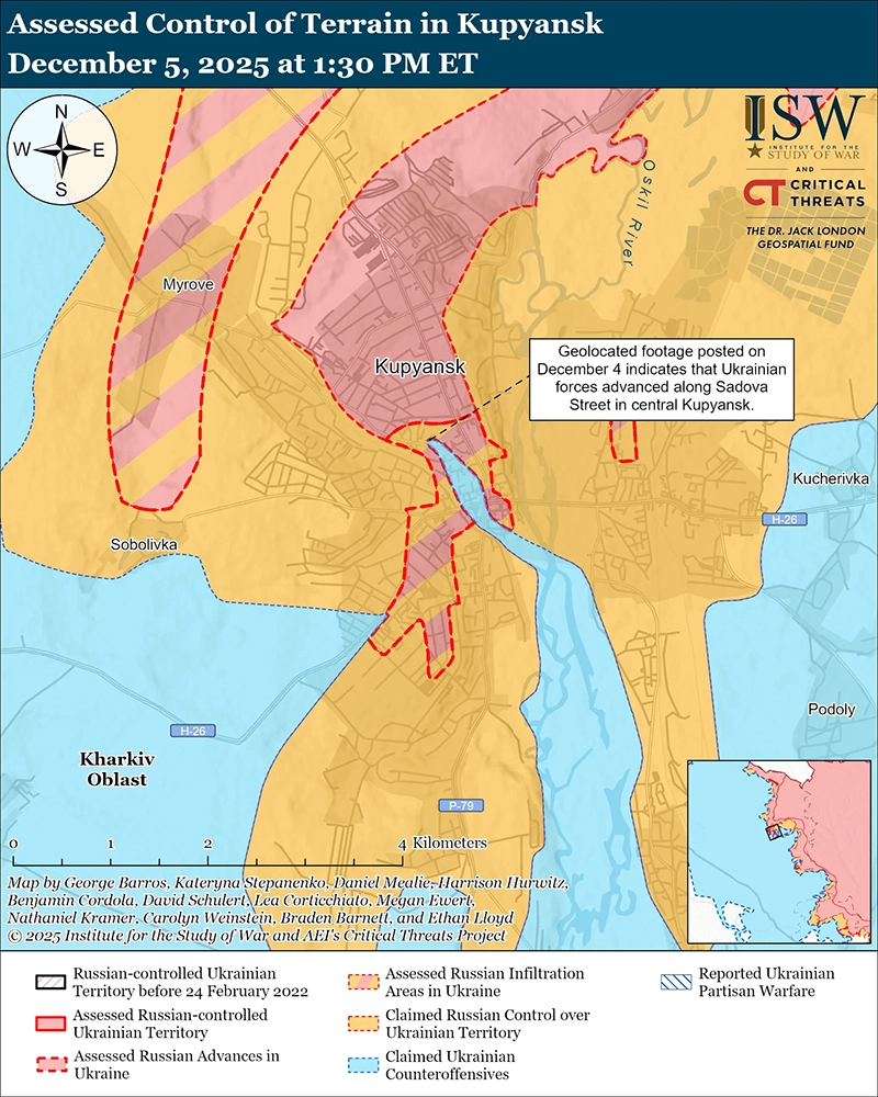 Доступная информация из открытых источников свидетельствует о том, что по состоянию на 5 декабря российские войска не окружили украинские силы в Мирнограде, поскольку российские войска продолжают усилия по завершению окружения Покровско-Мирноградского котла. Геолокационные кадры, опубликованные 4 декабря, показывают, что российские войска недавно продвинулись к северу и юго-востоку от Мирнограда (к востоку от Покровска). [5] Дополнительные геолокационные кадры, опубликованные 4 декабря, указывают, что российские войска также проникли на позиции в северо-западной части Покровска. [6] Однако эти геолокации пока не являются решающими для того, чтобы российские войска достигли полного сухопутного окружения украинских войск в Покровско-Мирноградском котле. Командующий украинским 7-м корпусом быстрого реагирования Десантно-штурмовых войск, командир бригадный генерал Евгений Ласийчук сообщил 5 декабря, что российские войска не окружили Покровско-Мирноградский котёл и что украинские войска удерживают северный Покровск и сохраняют позиции в центральном Покровске. [7] Ласийчук отметил, что российские войска избегают городских боев и вместо этого пытаются обойти Покровск с флангов. ISW продолжает оценивать, что российские войска, скорее всего, завершат захват Покровска и Мирнограда после 21-месячной кампании, хотя сроки и оперативные последствия этих захватов остаются неясными на данный момент.[8] Хотя ISW не видел визуальных доказательств или официальных украинских отчетов, которые позволили бы оценить, что российские войска окружили украинские силы в Мирнограде, ситуация, скорее всего, чрезвычайно сложная, и российские войска, скорее всего, могут нарушить узкие украинские пути эвакуации и наземные линии коммуникаций (НЛК) с помощью артиллерии и беспилотников.