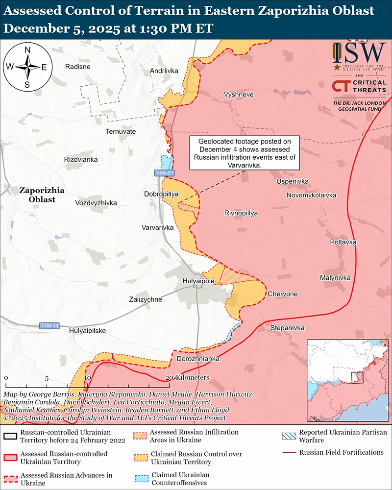 Оценка российских инфильтраций: геолокационные кадры, опубликованные 4 и 5 декабря, показывают, как украинские войска наносят удары по российским позициям к востоку от Варваровки (к северу от Гуляйполя) в ходе, по оценке ISW, российской операции по инфильтрации, которая на тот момент не привела к изменению контроля над местностью или переднего края зоны боевых действий (FEBA).[75]