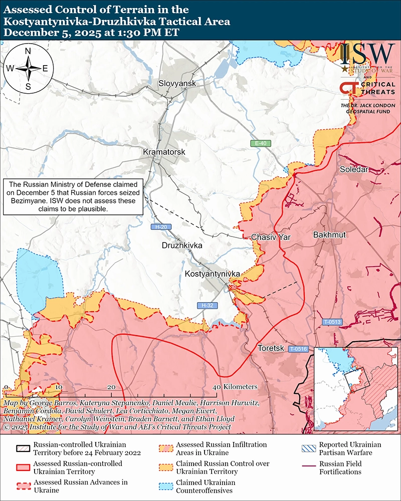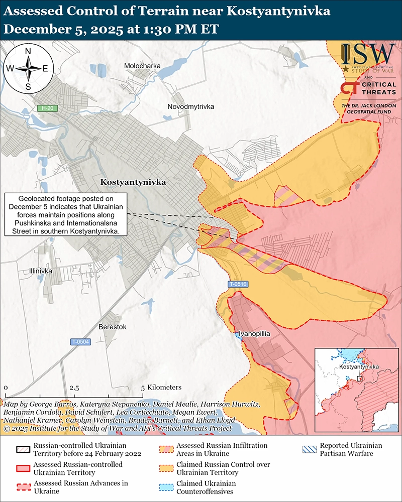 Уточнение территорий, на которые претендуют российские силы: геолокационные кадры, опубликованные 4 декабря, указывают на то, что украинские войска сохраняют позиции в южной и юго-восточной части Константиновки — районах, где, по ранее заявленным российским источникам, сохранялось присутствие российских войск.[60]