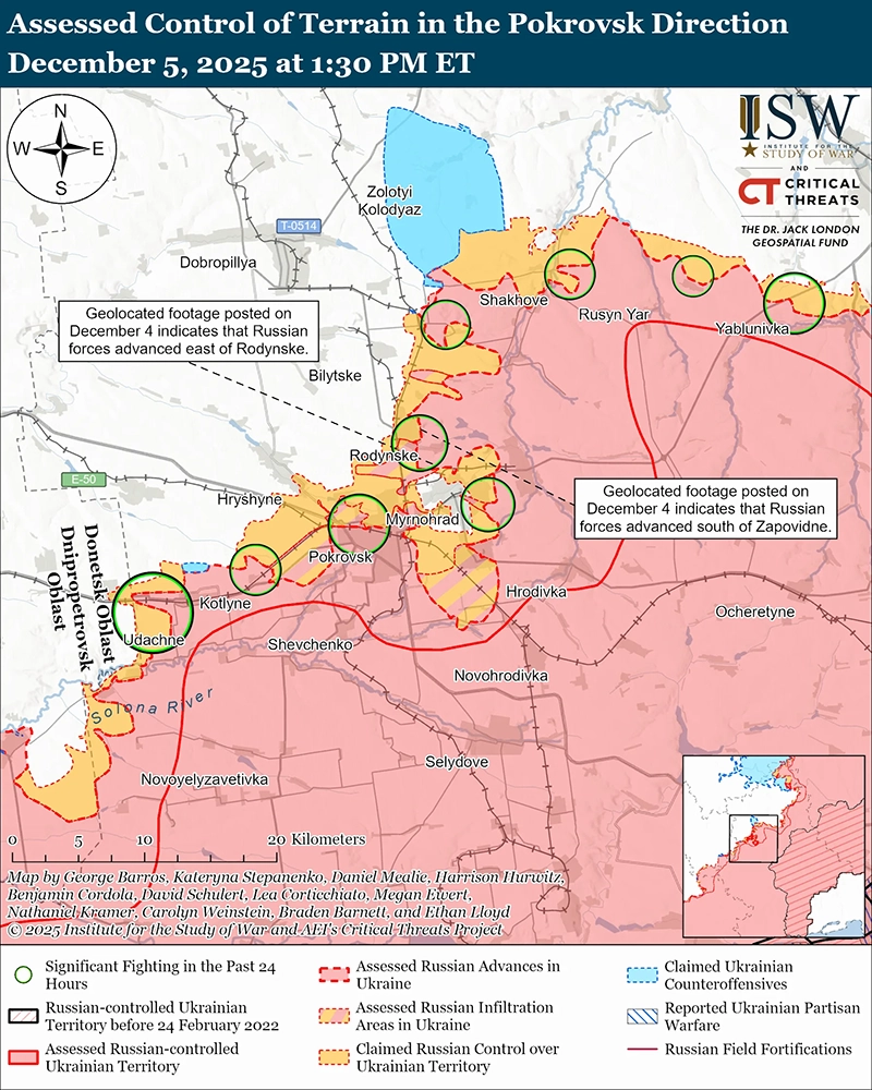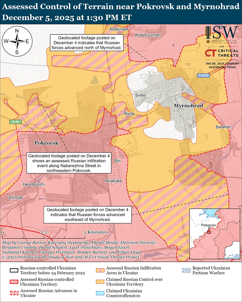 - Имеющаяся информация из открытых источников свидетельствует о том, что по состоянию на 5 декабря российские войска не окружили украинские силы в Мирнограде, поскольку российские войска продолжают усилия по завершению окружения Покровско-Мирноградского котла.