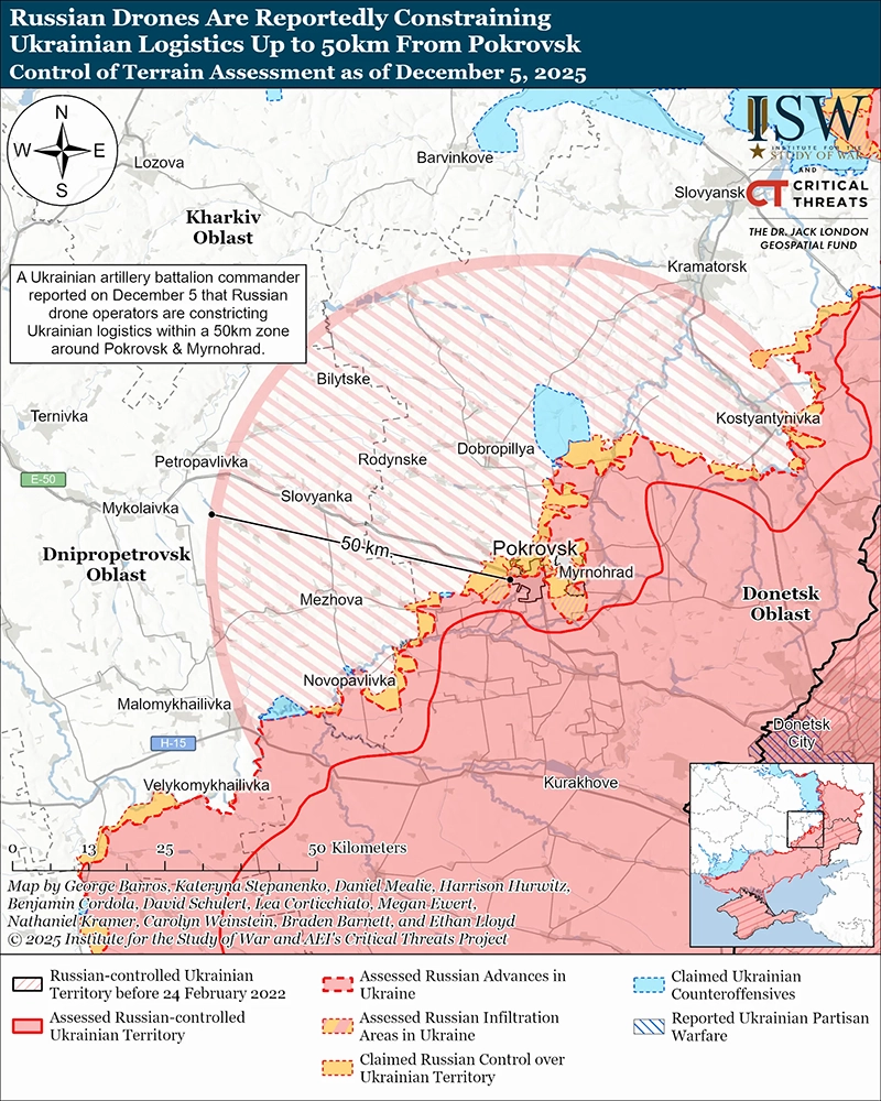 Российские войска пытаются полностью лишить украинскую логистику тактического и оперативного уровня на Покровском направлении, используя беспилотники для достижения эффекта воздушного перехвата на поле боя (BAI). Командир украинского артиллерийского дивизиона, действующий на Покровском направлении, сообщил 5 декабря, что российские войска используют беспилотники для попытки пресечения украинских наземных целей в радиусе 50 километров от Покровска, но украинские войска пытаются смягчить этот эффект.[9] Ласийчук отметил, что украинские войска способны осуществлять снабжение и проводить ротации в Покровско-Мирноградском котле и работают над расширением наземного центра к северу от котла.[10] Развивающийся план российской кампании основан на достижении частичного эффекта воздушного перехвата на поле боя (BAI) против украинской логистики на оперативной глубине (примерно от 25 до 100 километров) в течение нескольких месяцев, чтобы ослабить украинские оборонительные возможности, так что российским войскам будет легче продвигаться против ослабленных украинских войск.[11] Российские войска выделили элитные подразделения беспилотников, такие как Центр передовых беспилотных технологий «Рубикон», для нанесения ударов по украинской логистике и операторам беспилотников на оперативной глубине.[12] Успешная российская кампания BAI в радиусе 50 километров от Покровска также повлияет на украинскую логистику в направлениях Краматорска, Константиновки и Новопавловки и, вероятно, позволит российским войскам быстрее продвигаться вперед, особенно если российским войскам удастся повторить успехи кампании на других участках линии фронта.