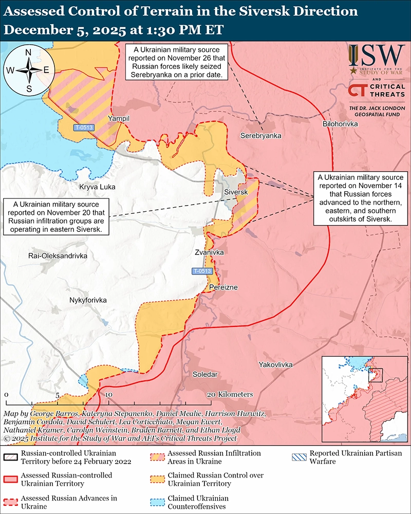 Оценка российского проникновения: украинский военный источник опубликовал 26 ноября карту, показывающую, что российские войска действуют в восточном Северске, а имеющиеся видеоматериалы свидетельствуют о продолжающемся украинском присутствии в восточном Северске, что указывает на то, что российские и украинские позиции перемешаны в восточном Северске.[54]