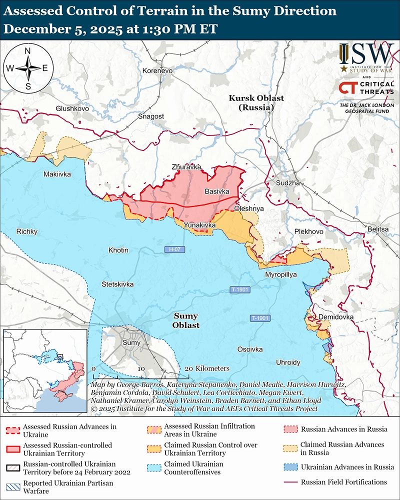 Представитель украинской бригады, действующей в Сумской области, сообщил 5 декабря, что российские войска используют туманные погодные условия, которые затрудняют работу украинских беспилотников, для атаки украинских позиций в Сумской области.[30] ISW ранее наблюдал, как российские войска используют плохие погодные условия, которые затрудняют действия украинских беспилотников на севере Сумской области.[31]