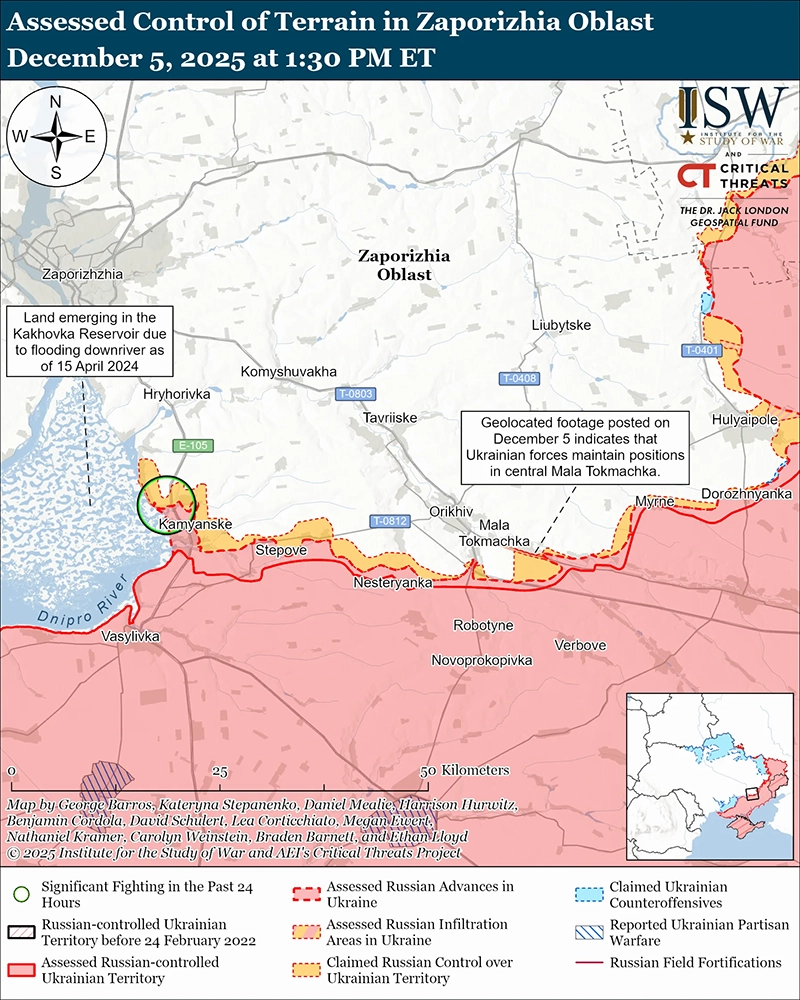 Уточнение территории, на которую претендуют российские войска: Геолокационные кадры, опубликованные 4 декабря, указывают на то, что украинские войска сохраняют позиции в восточной части Малой Токмачки (к юго-востоку от Орехова), районе, где, по заявлениям российских источников, ранее сохранялось присутствие российских войск.[83]