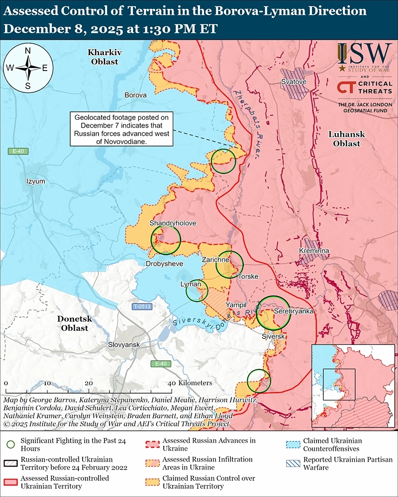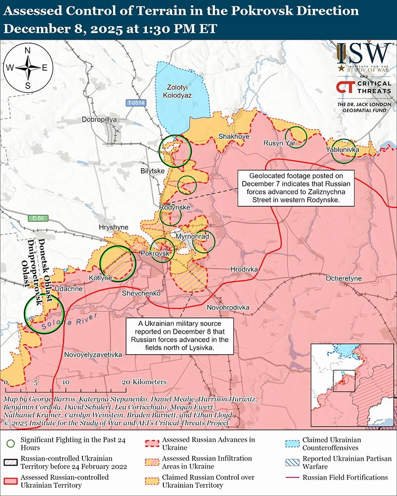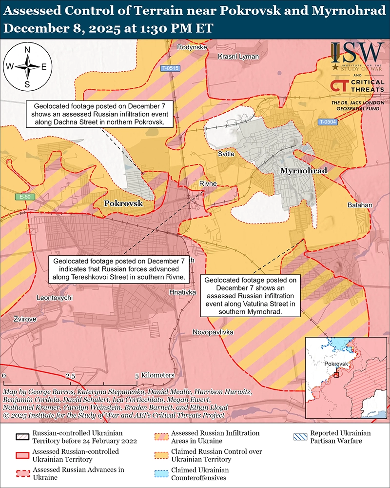 Оценка российского продвижения: геолокационные кадры, опубликованные 7 декабря, показывают, что российские войска недавно продвинулись в северо-западном Родинском (к северу от Покровска), хотя ISW оценивает, что Родинское остается спорным населенным пунктом, подверженным быстрым изменениям в контроле над местностью и FEBA.[63] Дополнительные геолокационные кадры, опубликованные 7 декабря, показывают, что российские войска продвинулись вдоль трассы Т-0504 Покровск-Мирноград на юго-западе Ровно (к северо-востоку от Покровска).[64] Украинское издание «Украинская правда» сообщило 8 декабря, что российские войска захватили Лысовку и Сухой Яр (оба к юго-востоку от Покровска) после того, как украинские войска отошли из населенных пунктов в неустановленную дату.[65]