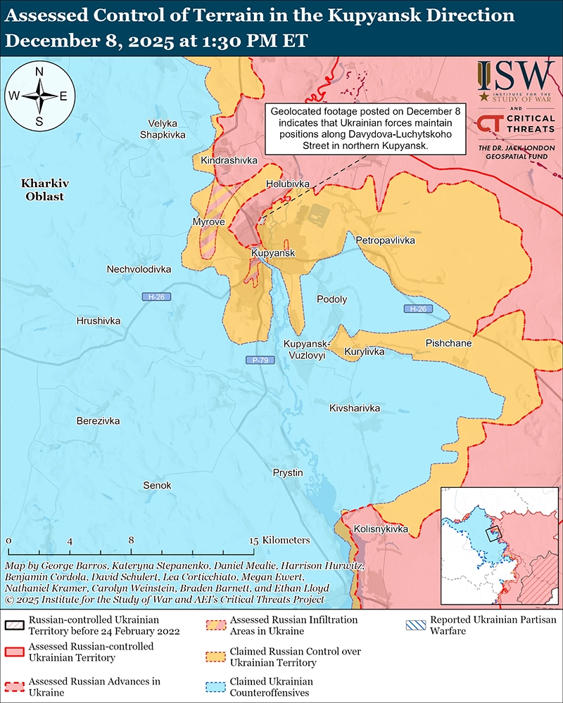 Российские войска атаковали к западу от Купянска возле Соболевки; к востоку от Купянска возле Петропавловки и Кучеровки; и к юго-востоку от Купянска, возле Песчаное, 7 и 8 декабря. [28] Российские военные блогеры утверждали, что украинские войска контратаковали севернее и внутри Купянска, к западу от Песчаного и возле Соболевки. [29]