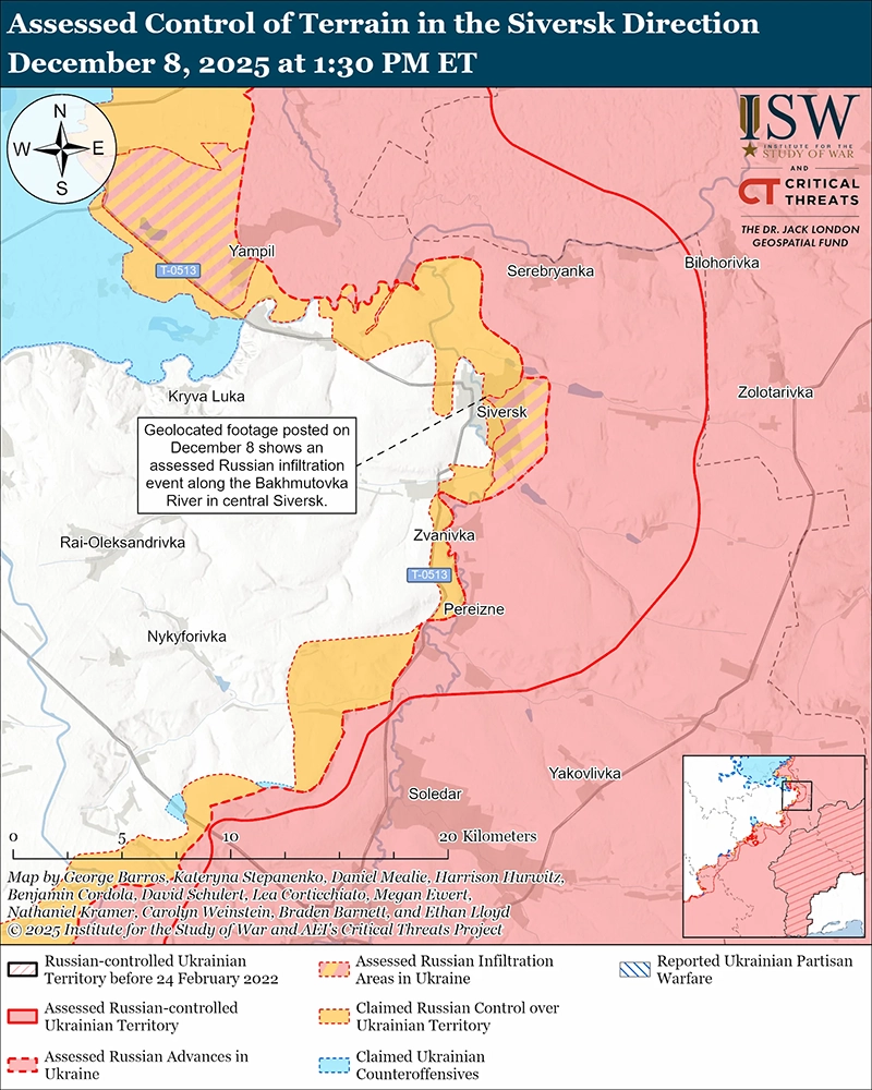 Российские войска атаковали внутри и вокруг Северска; северо-западнее Северска возле Закитного, Ямполя, Дибровы и Дроновки; северо-восточнее Северска возле Серебрянки; и юго-западнее Северска, возле Свято-Покровского и Федоровки 7 и 8 декабря. [46]