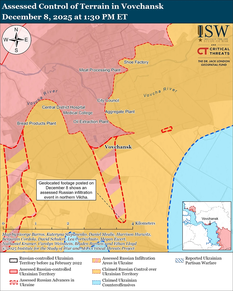 Уточнение территорий, подлежащих контролю России: геолокационные кадры, опубликованные 7 декабря, показывают, как российские войска наносят удары по украинским войскам на севере Купянска — районе, где, по данным российских источников, ранее присутствовали российские войска. [27]