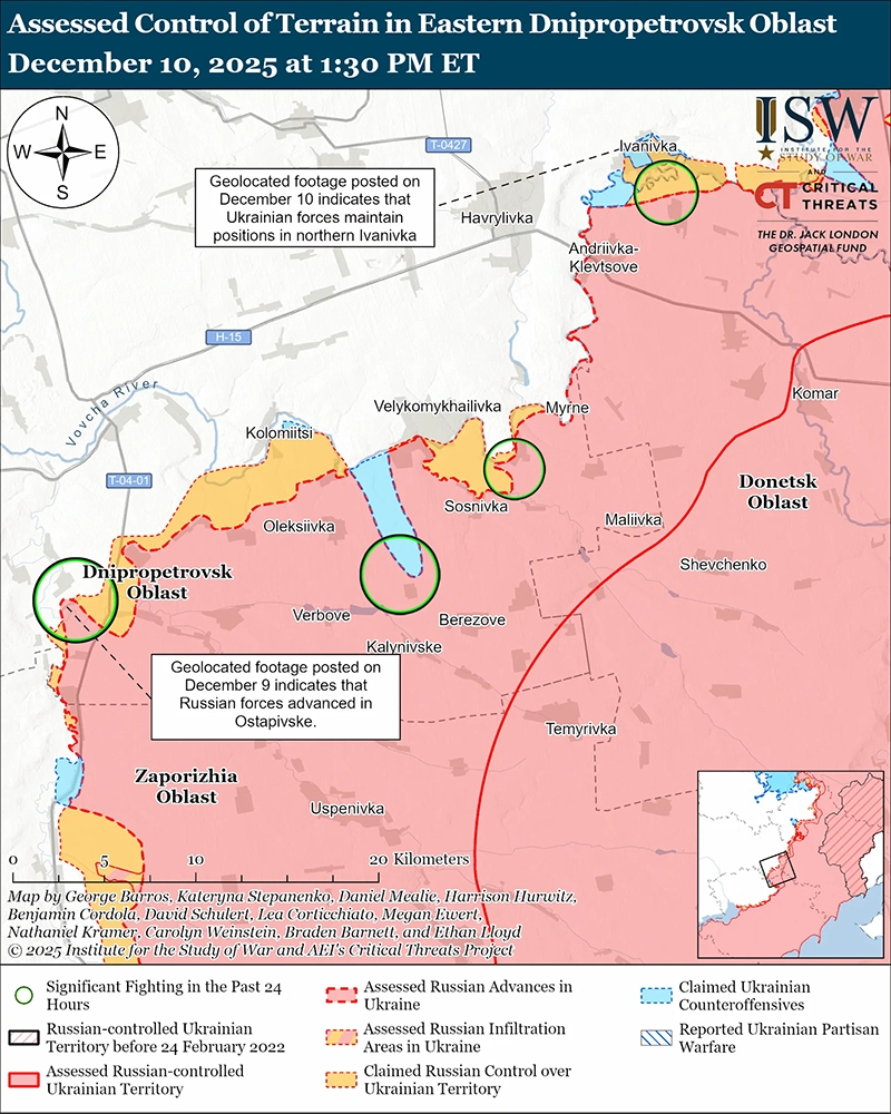 Уточнение территорий, находящихся под российским контролем: геолокационные кадры, опубликованные 10 декабря, показывают действия украинских войск на северной окраине Ивановки (северо-восточнее Александровки) — районе, где, по данным российских источников, ранее присутствовали российские войска. [101]
