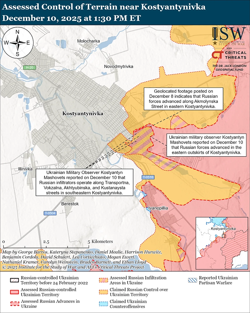 Оценка российских проникновений: Машовец сообщил 10 декабря, что российские войска удерживают позиции на юге и юго-востоке Константиновки. [73] ISW оценивает, что это событие не изменило контроль над местностью или передовой границей зоны боевых действий (FEBA) на данный момент.