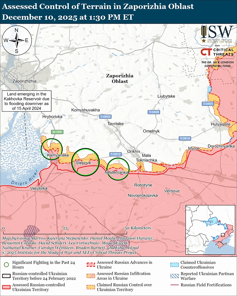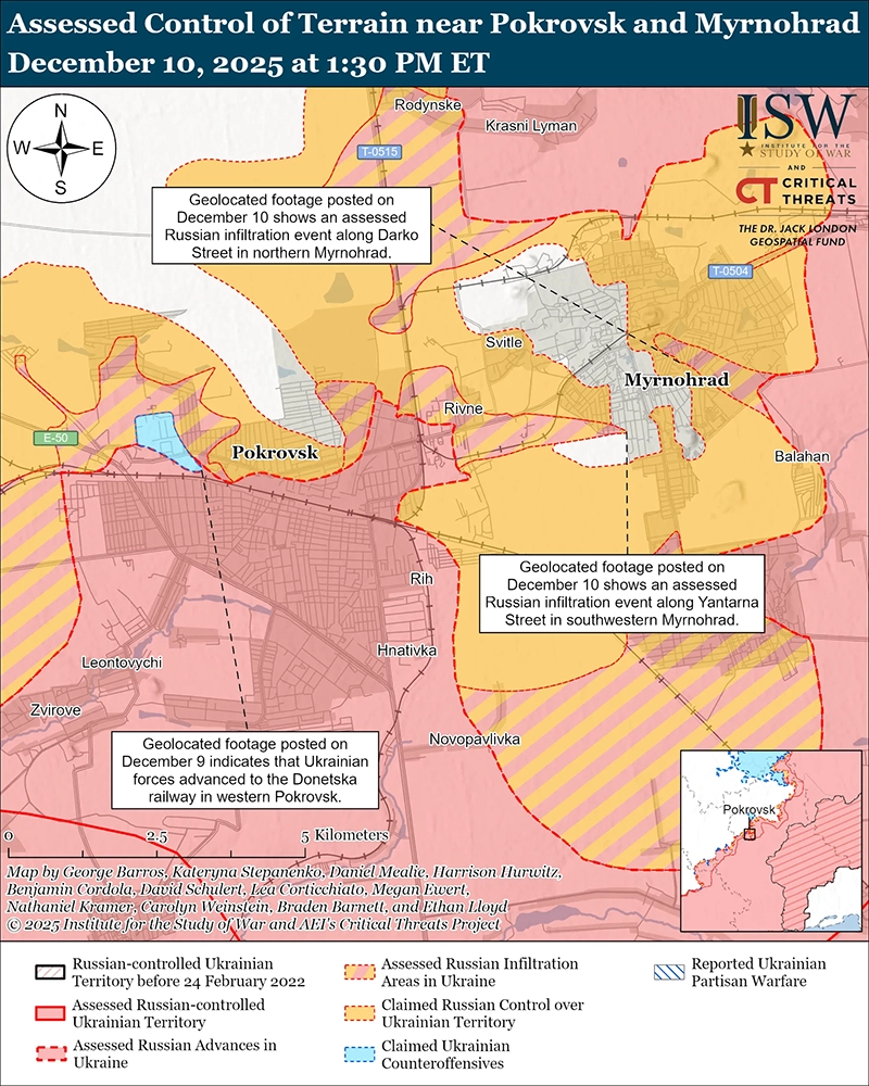 Имеющаяся в открытом доступе информация указывает на то, что российские войска еще не захватили Покровск, но ситуация в районе Покровска-Мирнограда остается сложной. ISW продолжает оценивать вероятность захвата Покровска и Мирнограда российскими войсками, но для этого потребуется больше времени и потери. Опубликованные 9 декабря видеозаписи с геолокацией показывают, что украинские войска действуют вдоль Донецкой железной дороги на северо-западе Покровска и на северо-западе Мирнограда (к востоку от Покровска), либо сохранив, либо недавно отвоевав эти позиции.[22] Однако ситуация для украинских войск в Покровско-Мырноградском котле остается серьезной. Российские войска продолжают проникать в центральную и западную часть Мирнограда.[23] Представитель украинской бригады, действующей на Покровском направлении, сообщил, что российские войска одновременно атакуют сам Мирноград и его фланги, а также перехватывают украинскую логистику.[24] Представитель Украины заявил, что у украинских войск есть лишь ограниченные возможности для проведения ротаций из-за российских ударов и операций по проникновению, что требует тщательной подготовки к каждой ротационной миссии. Представитель заявил, что российские войска продолжают авиаудары по укрепленным позициям Украины и пытаются сочетать крупные серии ударов с наземными операциями. Представитель сообщил, что российские войска используют бронетехнику вблизи Покровска, а 7-й Корпус быстрого реагирования ДШВ Украины сообщил, что подразделения 76-й воздушно-десантной (ВДВ) дивизии воспользовались плохими погодными условиями для проведения механизированного штурма с юга на север Покровска.[25] Опубликованные 10 декабря видеозаписи с геолокацией показывают, как российские войска проводят механизированный штурм силой до взвода в западном Покровске.[26] Эти сообщения указывают на то, что российским войскам удалось перебросить по меньшей мере часть техники в Покровск после того, как украинские усилия по перехвату успешно предотвратили операции российской механизированной и моторизованной техники в направлении Покровска в середине ноября 2025 года.[27] 10 декабря главнокомандующий украинскими войсками генерал-полковник Александр Сырский заявил, что украинские силы все еще действуют в северном Покровске, но признал, что в неуказанную дату украинских сил в Покровске не было, что предполагает, что украинские силы недавно отвоевали ограниченные позиции в городе.[28] Сырский признал, что украинские силы отступили из районов Сухой Яр, Лысовка и Новопавловка к югу и юго-востоку от Покровска в неуказанную дату.