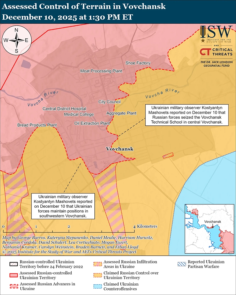 Оценка продвижения России: украинский военный наблюдатель Константин Машовец сообщил 10 декабря, что российские войска захватили Волчанское техническое училище в центре Волчанска (к северо-востоку от Харькова). [44]