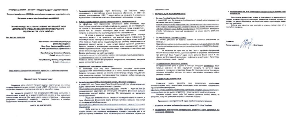 У згаданому зверненні громадська організація звинувачує Наглядову раду в тому, що та фактично публічно підтримала чинний менеджмент і взяла на себе роль «білильної дошки» для керівництва підприємства. Автори листа вказують на дисонанс між заявами Ради про «суворий контроль» і реальними фактами кримінальних проваджень, фігурантом яких є як генеральний директор, так і виплати самій Раді. Окремо наголошується, що спроби представити ситуацію як прозору за допомогою «сумнівного аудиту» не замінюють повноцінної незалежної перевірки фінансової діяльності підприємства.