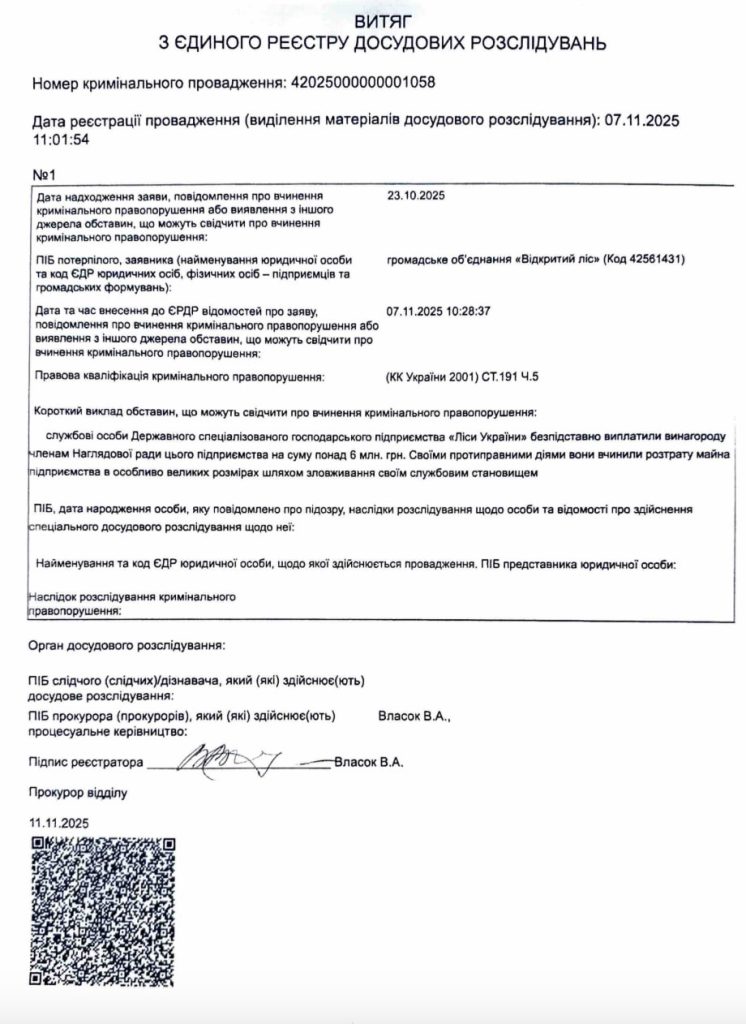 У розпорядженні редакції опинився витяг з ЄРДР щодо діяльності ДП «Ліси України». Слідство перевіряє можливу незаконну виплату понад 6 млн грн членам Наглядової ради. Провадження № 42025000000001058 відкрито за ч. 5 ст. 191 ККУ — розтрата в особливо великих розмірах.
