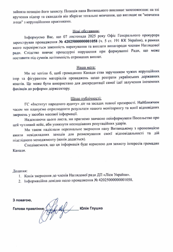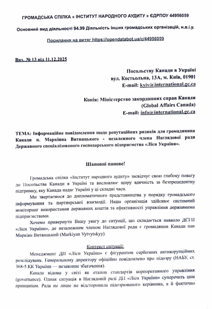 Окреме звернення адресоване Посольству Канади, де йдеться про ситуацію навколо канадського громадянина Маркіяна Витвицького — ще одного незалежного члена Наглядової ради ДСГП «Ліси України». Автори документа нагадують, що Канада має репутацію держави з високими стандартами корпоративного управління, але поведінка Наглядової ради підприємства, на їхню думку, цим стандартам не відповідає. Вказується, що Рада не лише не відсторонила керівника, якому повідомлено про підозру, а й фактично взялася його захищати, тоді як сам Витвицький зберігає «тотальне мовчання», що ззовні виглядає як мовчазна згода з корупційними практиками.