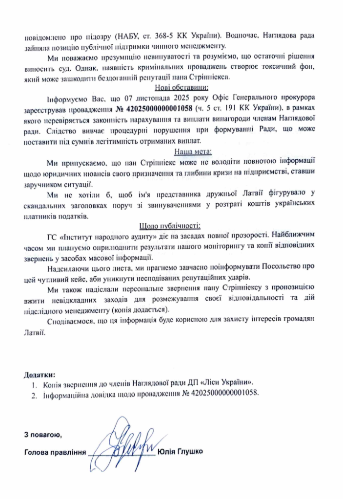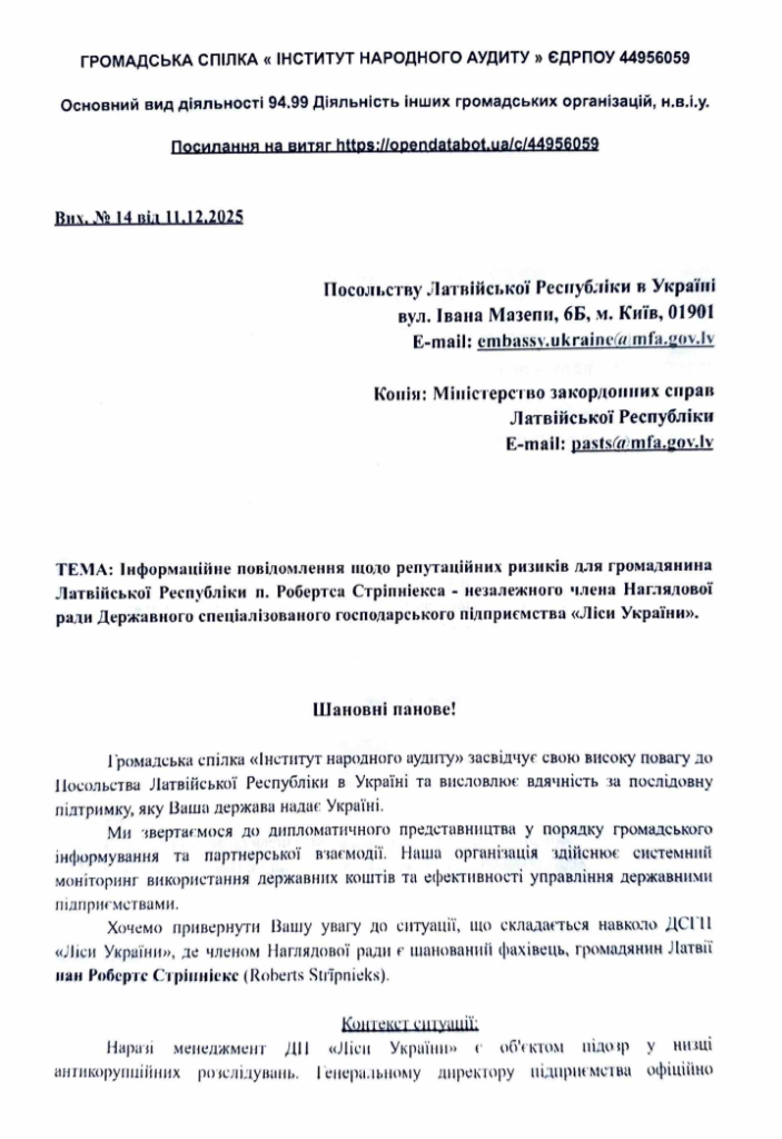 Аналогічний за змістом лист спрямовано до Посольства Латвійської Республіки. У ньому йдеться про Робертса Стріпніекса, відомого латвійського фахівця, який також входить до складу Наглядової ради «Лісів України». Громадська спілка дякує Латвії за підтримку України, але водночас попереджає, що ім’я її громадянина може опинитися в центрі скандальних публікацій поруч із звинуваченнями у розтраті коштів українських платників податків. Як і у фінському кейсі, акцент робиться на новому провадженні щодо винагороди членам Наглядової ради та на відсутності реакції самої Ради на попередження громадськості.